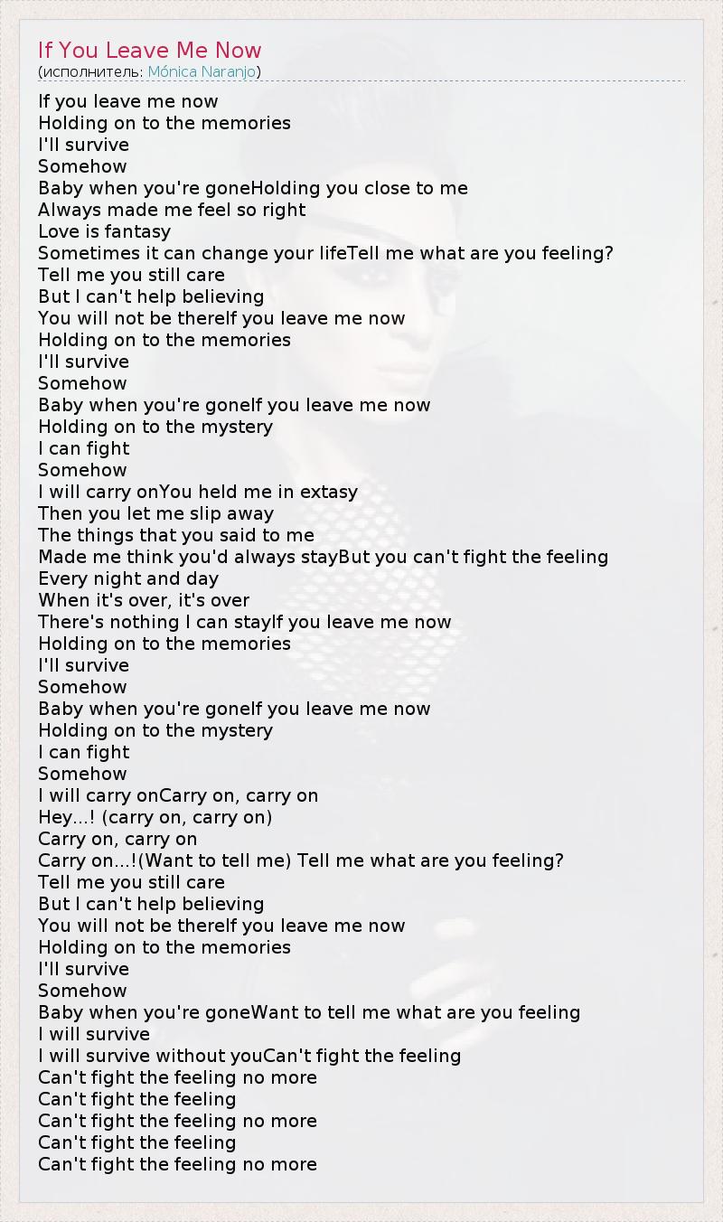 If you leave me now Holding on to the memories I'll survive Somehow Baby when you're goneHolding you close to me Always made me feel so right Love is fantasy Sometimes it can change your lifeTell me what are you feeling? Tell me you still care But I can't help believing You will not be thereIf you leave me now Holding on to the memories I'll survive Somehow Baby when you're goneIf you leave me now Holding on to the mystery I can fight Somehow I will carry onYou held me in extasy Then you let me slip away The things that you said to me Made me think you'd always stayBut you can't fight the feeling Every night and day When it's over, it's over There's nothing I can stayIf you leave me now Holding on to the memories I'll survive Somehow Baby when you're goneIf you leave me now Holding on to the mystery I can fight Somehow I will carry onCarry on, carry on Hey...! (carry on, carry on) Carry on, carry on Carry on...!(Want to tell me) Tell me what are you feeling? Tell me you still care But I can't help believing You will not be thereIf you leave me now Holding on to the memories I'll survive Somehow Baby when you're goneWant to tell me what are you feeling I will survive I will survive without youCan't fight the feeling Can't fight the feeling no more Can't fight the feeling Can't fight the feeling no more Can't fight the feeling Can't fight the feeling no more