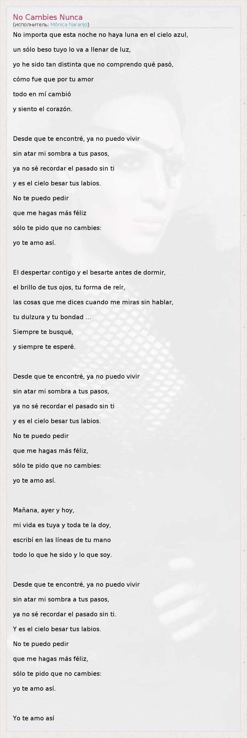 No importa que esta noche no haya luna en el cielo azul, un sólo beso tuyo lo va a llenar de luz, yo he sido tan distinta que no comprendo qué pasó, cómo fue que por tu amor todo en mí cambió y siento el corazón. Desde que te encontré, ya no puedo vivir sin atar mi sombra a tus pasos, ya no sé recordar el pasado sin ti y es el cielo besar tus labios. No te puedo pedir que me hagas más féliz sólo te pido que no cambies: yo te amo así. El despertar contigo y el besarte antes de dormir, el brillo de tus ojos, tu forma de reír, las cosas que me dices cuando me miras sin hablar, tu dulzura y tu bondad ... Siempre te busqué, y siempre te esperé. Desde que te encontré, ya no puedo vivir sin atar mi sombra a tus pasos, ya no sé recordar el pasado sin ti y es el cielo besar tus labios. No te puedo pedir que me hagas más féliz, sólo te pido que no cambies: yo te amo así. Mañana, ayer y hoy, mi vida es tuya y toda te la doy, escribí en las líneas de tu mano todo lo que he sido y lo que soy. Desde que te encontré, ya no puedo vivir sin atar mi sombra a tus pasos, ya no sé recordar el pasado sin ti. Y es el cielo besar tus labios. No te puedo pedir que me hagas más féliz, sólo te pido que no cambies: yo te amo así. Yo te amo así