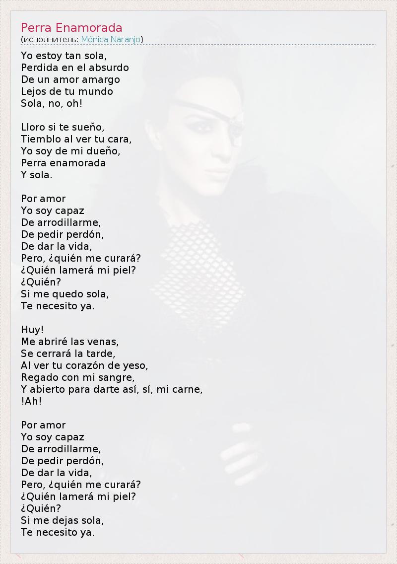 Yo estoy tan sola, Perdida en el absurdo De un amor amargo Lejos de tu mundo Sola, no, oh! Lloro si te sueño, Tiemblo al ver tu cara, Yo soy de mi dueño, Perra enamorada Y sola. Por amor Yo soy capaz De arrodillarme, De pedir perdón, De dar la vida, Pero, ¿quién me curará? ¿Quién lamerá mi piel? ¿Quién? Si me quedo sola, Te necesito ya. Huy! Me abriré las venas, Se cerrará la tarde, Al ver tu corazón de yeso, Regado con mi sangre, Y abierto para darte así, sí, mi carne, !Ah! Por amor Yo soy capaz De arrodillarme, De pedir perdón, De dar la vida, Pero, ¿quién me curará? ¿Quién lamerá mi piel? ¿Quién? Si me dejas sola, Te necesito ya.