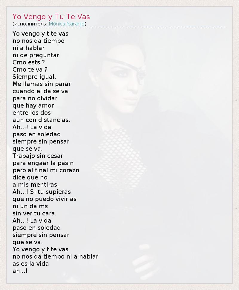 Yo vengo y t te vas no nos da tiempo ni a hablar ni de preguntar Cmo ests ? Cmo te va ? Siempre igual. Me llamas sin parar cuando el da se va para no olvidar que hay amor entre los dos aun con distancias. Ah...! La vida paso en soledad siempre sin pensar que se va. Trabajo sin cesar para engaar la pasin pero al final mi corazn dice que no a mis mentiras. Ah...! Si tu supieras que no puedo vivir as ni un da ms sin ver tu cara. Ah...! La vida paso en soledad siempre sin pensar que se va. Yo vengo y t te vas no nos da tiempo ni a hablar as es la vida ah...!