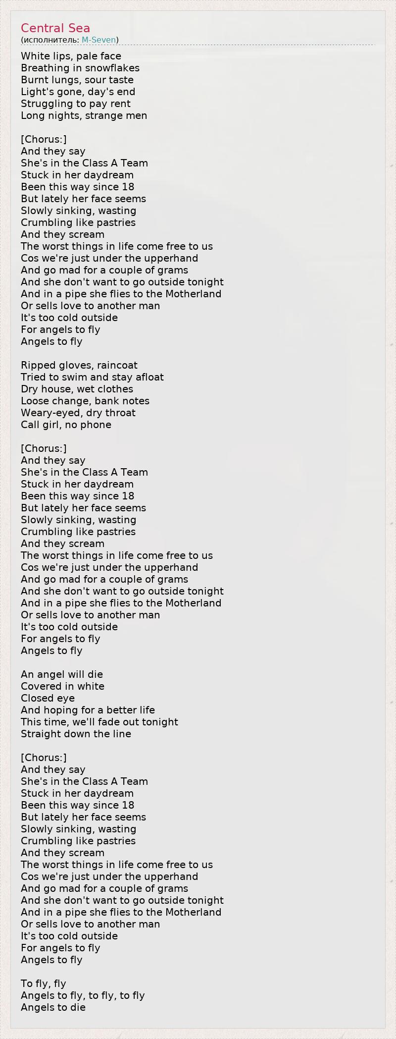 1 - класс А – одна из трех групп наркотических средств по классификации в Великобритании. К нему относятся ЛСД, экстази, героин, метадон, кокаин и др. Речь о том, что героиня песни употребляет героин