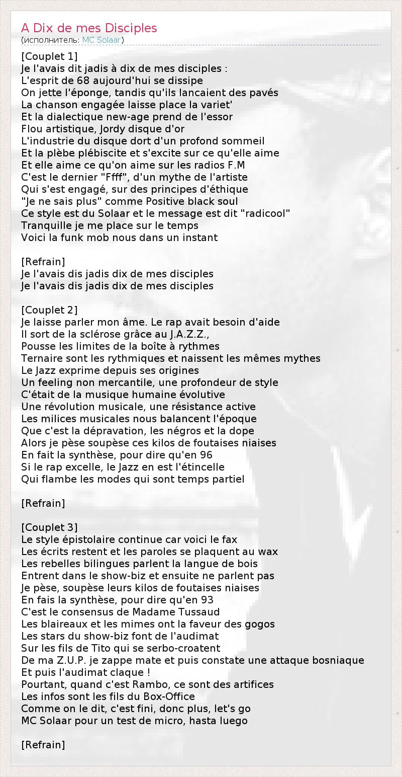 [Couplet 1] Je l'avais dit jadis à dix de mes disciples : L'esprit de 68 aujourd'hui se dissipe On jette l'éponge, tandis qu'ils lancaient des pavés La chanson engagée laisse place la variet' Et la dialectique new-age prend de l'essor Flou artistique, Jordy disque d'or L'industrie du disque dort d'un profond sommeil Et la plèbe plébiscite et s'excite sur ce qu'elle aime Et elle aime ce qu'on aime sur les radios F.M C'est le dernier "Ffff", d'un mythe de l'artiste Qui s'est engagé, sur des principes d'éthique "Je ne sais plus" comme Positive black soul Ce style est du Solaar et le message est dit "radicool" Tranquille je me place sur le temps Voici la funk mob nous dans un instant [Refrain] Je l'avais dis jadis dix de mes disciples Je l'avais dis jadis dix de mes disciples [Couplet 2] Je laisse parler mon âme. Le rap avait besoin d'aide Il sort de la sclérose grâce au J.A.Z.Z., Pousse les limites de la boîte à rythmes Ternaire sont les rythmiques et naissent les mêmes mythes Le Jazz exprime depuis ses origines Un feeling non mercantile, une profondeur de style C'était de la musique humaine évolutive Une révolution musicale, une résistance active Les milices musicales nous balancent l'époque Que c'est la dépravation, les négros et la dope Alors je pèse soupèse ces kilos de foutaises niaises En fait la synthèse, pour dire qu'en 96 Si le rap excelle, le Jazz en est l'étincelle Qui flambe les modes qui sont temps partiel [Refrain] [Couplet 3] Le style épistolaire continue car voici le fax Les écrits restent et les paroles se plaquent au wax Les rebelles bilingues parlent la langue de bois Entrent dans le show-biz et ensuite ne parlent pas Je pèse, soupèse leurs kilos de foutaises niaises En fais la synthèse, pour dire qu'en 93 C'est le consensus de Madame Tussaud Les blaireaux et les mimes ont la faveur des gogos Les stars du show-biz font de l'audimat Sur les fils de Tito qui se serbo-croatent De ma Z.U.P. je zappe mate et puis constate une attaque bosniaque Et puis l'audimat claque ! Pourtant, quand c'est Rambo, ce sont des artifices Les infos sont les fils du Box-Office Comme on le dit, c'est fini, donc plus, let's go MC Solaar pour un test de micro, hasta luego [Refrain]