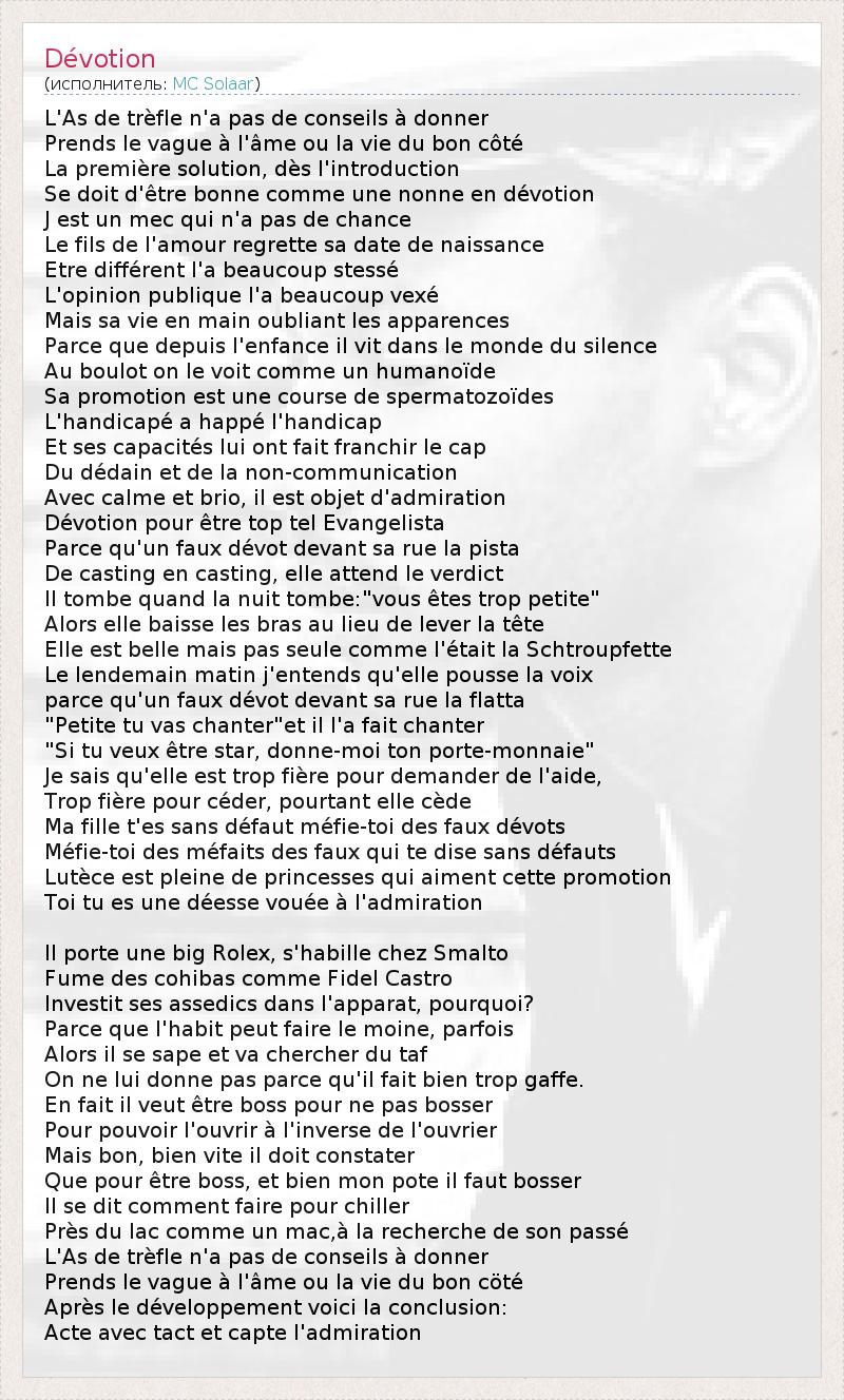 Туз треф не может дать совет: Выбери неясность мысли или светлую сторону жизни. Первое решение, вступление Должно быть хорошо, как набожная монашка. Я — парень, которому не везет, Сын любви, проклинающий день своего рождения. Быть другим, когда все вокруг похоже, Раздраженный общественным мнением. Но его жизнь — это забвение видимого, Потому что с детства он жил в мире тишины. На работе он видит одних гуманоидов, Он продвигает сперматозоиды. Инвалид, который собирает трудности И свои способности, которыми он преодолевает проблемы, Презрение и отшельничество 1 Спокойно и виртуозно. Он — объект восхищения, Предан быть на вершине, как Евангелиста 2, Потому что на улице его преследуют лицемеры. От кастинга к кастингу она ждет приговор, Он падает, когда наступает ночь: "Ты слишком мал". Потом она опускает руки, вместо того чтобы поднять голову. Она красива, но не одна, как Смурфетта 3. На следующее утро я слышу, как она тренирует свой голос, Потому что лицемеры льстят на улице. "Малышка, пой" и они просят ее спеть. "Если хочешь стать звездой, дай мне свой кошелек". Я знаю, она слишком гордая, чтобы просить помощи, Слишком гордая, чтобы уступить, однако она уступает. Моя девочка, ты безупречна, остерегайся лицемеров, Остерегайся злодеев, обманщиков, которые говорят, что ты безупречна. В Лютеции 4 полно принцесс, которым это нравится. Ты — богиня, посвященная восхищению. Он носит большие Rolex 5, одетый в Smalto 6, Курит коиба 7, как Фидель Кастро 8. Выкладывает все свое великолепие, зачем? Потому что платье может сделать монахом, иногда. Тогда он одевается и хочет затянуться, Он ничего не получает, потому что слишком осторожен. На самом деле он хочет быть боссом, чтобы не вкалывать, Чтобы открыть обратную сторону открытого. Но уже пора понять, Чтобы быть босом, приятель, нужно вкалывать. Он думает о том, как охладиться Рядом с озером, как сутенер в поисках своего прошлого. Туз треф не может дать совет. Выбери неясность мысли или светлую сторону жизни. После развития вот и вывод: Закон с чувством такта пользуется восхищением. 1 - Досл.: необщение 2 - Линда Евангелиста — канадская топ-модель итальянского происхождения. 3 - Героиня комиксов и анимационного сериала "The Smurfs" (Смурфы) о существах, придуманных и нарисованных бельгийским художником Пьером Кюллифором . В России смурфы известны, прежде всего, благодаря игрушкам (синего цвета в белой одежде и с желтыми волосами) из шоколадных яиц. 4 - Арены Лютеции (Arènes de Lutèce) — древнейшая сохранившаяся постройка на территории Парижа, древнеримский амфитеатр. 5 - Культовые швейцарские часы. 6 - Марка мужской одежды от известного дизайнера Франческо Смальто (Francesco Smalto), основанная в 1962 году. 7 - Cohiba — молодая марка кубинских сигар, один из ведущих брендов в мире на сигарном рынке. 8 - Кубинский революционный и политический деятель, руководитель Кубы с 1959 по 2008 год.