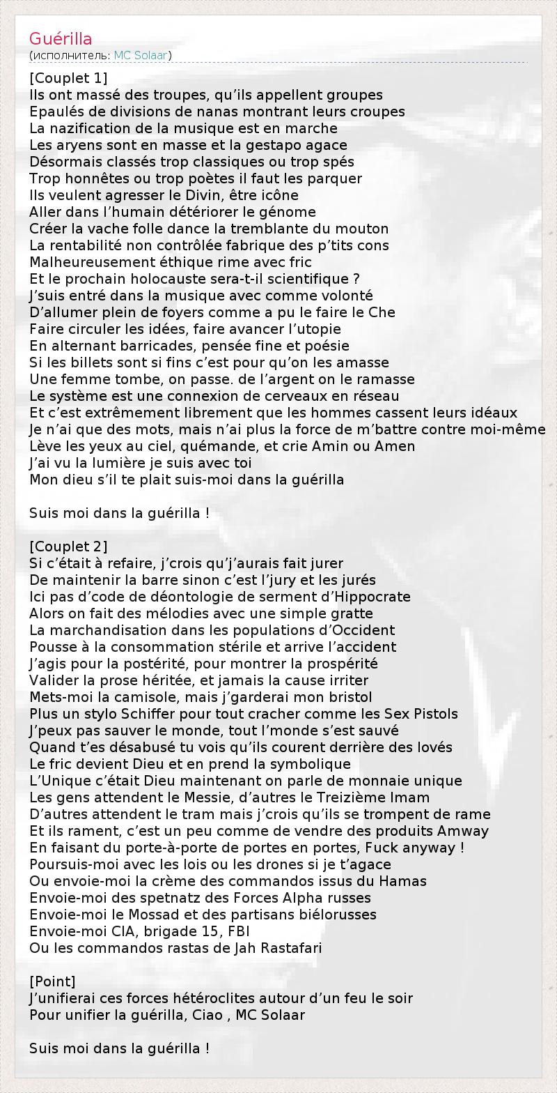 Это интересно:Во Франции существовали предпосылки появления такого стиля как рэп, ведь это страна трубадуров, которые славились богатствами языка и рифмы. Было необходимо лишь появление этого вдохновленного человека, который мог бы соединить свой талант со всей мощью поэтичного французского языка. По иронии судьбы этот человек появляется во Франции из Чада, минуя Сенегал. Он великолепно понимает... продолжение