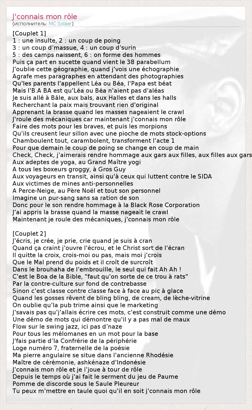 [Couplet 1] 1 : une insulte, 2 : un coup de poing 3 : un coup d’massue, 4 : un coup d’surin 5 : des camps naissent, 6 : on forme des hommes Puis ça part en sucette quand vient le 38 parabellum J'oublie cette géographie, quand j'vois une échographie Agrafe mes paragraphes en attendant des photographies Qu'les parents l'appellent Léa ou Béa, l'Papa est béat Mais l'B.A BA est qu'Léa ou Béa n'aient pas d'aléas Je suis allé à Bâle, aux bals, aux Halles et dans les halls Recherchant la paix mais trouvant rien d'original Apprenant la brasse quand les masses nageaient le crawl J'roule des mécaniques car maintenant j'connais mon rôle Faire des mots pour les braves, et puis les morpions Qu'ils creusent leur sillon avec une pioche de mots stock-options Chamboulent tout, carambolent, transforment l'acte 1 Pour que demain le coup de poing se change en coup de main Check, Check, j'aimerais rendre hommage aux gars aux filles, aux filles aux gars Aux adeptes de yoga, au Grand Maître yogi A tous les boxeurs groggy, à Gros Guy Aux voyageurs en transit, ainsi qu'à ceux qui luttent contre le SIDA Aux victimes de mines anti-personnelles A Perce-Neige, au Père Noël et tout son personnel Imagine un pur-sang sans sa ration de son Donc pour le son rendre hommage à la Black Rose Corporation J'ai appris la brasse quand la masse nageait le crawl Maintenant je roule des mécaniques, j'connais mon rôle [Couplet 2] J'écris, je crée, je prie, crie quand je suis à cran Quand ça craint j'ouvre l'écrou, et le Christ sort de l'écran Il quitte la croix, crois-moi ou pas, mais moi j'crois Que le Mal prend du poids et il croît de surcroît Dans le brouhaha de l'embrouille, le seul qui fait Ah Ah ! C'est le Boa de la Bible, "faut qu'on sorte de ce trou à rats" Par la contre-culture sur fond de contrebasse Sinon c'est classe contre classe face à face au pic à glace Quand les gosses rêvent de bling bling, de cream, de lèche-vitrine On oublie qu'la pub trime ainsi que le marketing J'savais pas qu'j'allais écrire ces mots, c'est construit comme une démo Une démo de mots qui démontre qu'il y a pas mal de maux Flow sur le swing jazz, ici pas d’naze Pour tous les mélomanes en un mot pour la base J'fais partie d’la Confrérie de la périphérie Loge numéro 7, fraternelle de la poésie Ma pierre angulaire se situe dans l'ancienne Rhodésie Maître de cérémonie, ashkénaze d'Indonésie J'connais mon rôle et je l'joue à tour de rôle Depuis le temps où j'ai fait le serment du jeu de Paume Pomme de discorde sous le Saule Pleureur Tu peux m'mettre en taule quoi qu'il en soit j'connais mon rôle