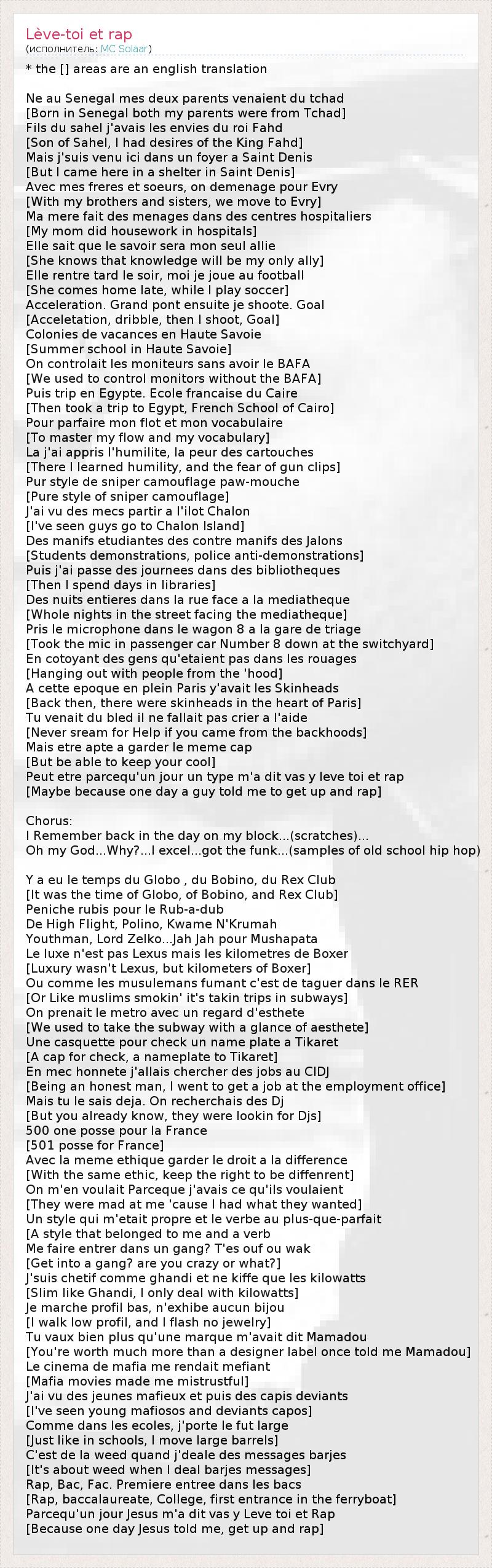 * the [] areas are an english translation Ne au Senegal mes deux parents venaient du tchad [Born in Senegal both my parents were from Tchad] Fils du sahel j'avais les envies du roi Fahd [Son of Sahel, I had desires of the King Fahd] Mais j'suis venu ici dans un foyer a Saint Denis [But I came here in a shelter in Saint Denis] Avec mes freres et soeurs, on demenage pour Evry [With my brothers and sisters, we move to Evry] Ma mere fait des menages dans des centres hospitaliers [My mom did housework in hospitals] Elle sait que le savoir sera mon seul allie [She knows that knowledge will be my only ally] Elle rentre tard le soir, moi je joue au football [She comes home late, while I play soccer] Acceleration. Grand pont ensuite je shoote. Goal [Acceletation, dribble, then I shoot, Goal] Colonies de vacances en Haute Savoie [Summer school in Haute Savoie] On controlait les moniteurs sans avoir le BAFA [We used to control monitors without the BAFA] Puis trip en Egypte. Ecole francaise du Caire [Then took a trip to Egypt, French School of Cairo] Pour parfaire mon flot et mon vocabulaire [To master my flow and my vocabulary] La j'ai appris l'humilite, la peur des cartouches [There I learned humility, and the fear of gun clips] Pur style de sniper camouflage paw-mouche [Pure style of sniper camouflage] J'ai vu des mecs partir a l'ilot Chalon [I've seen guys go to Chalon Island] Des manifs etudiantes des contre manifs des Jalons [Students demonstrations, police anti-demonstrations] Puis j'ai passe des journees dans des bibliotheques [Then I spend days in libraries] Des nuits entieres dans la rue face a la mediatheque [Whole nights in the street facing the mediatheque] Pris le microphone dans le wagon 8 a la gare de triage [Took the mic in passenger car Number 8 down at the switchyard] En cotoyant des gens qu'etaient pas dans les rouages [Hanging out with people from the 'hood] A cette epoque en plein Paris y'avait les Skinheads [Back then, there were skinheads in the heart of Paris] Tu venait du bled il ne fallait pas crier a l'aide [Never sream for Help if you came from the backhoods] Mais etre apte a garder le meme cap [But be able to keep your cool] Peut etre parcequ'un jour un type m'a dit vas y leve toi et rap [Maybe because one day a guy told me to get up and rap] Chorus: I Remember back in the day on my block...(scratches)... Oh my God...Why?...I excel...got the funk...(samples of old school hip hop) Y a eu le temps du Globo , du Bobino, du Rex Club [It was the time of Globo, of Bobino, and Rex Club] Peniche rubis pour le Rub-a-dub De High Flight, Polino, Kwame N'Krumah Youthman, Lord Zelko...Jah Jah pour Mushapata Le luxe n'est pas Lexus mais les kilometres de Boxer [Luxury wasn't Lexus, but kilometers of Boxer] Ou comme les musulemans fumant c'est de taguer dans le RER [Or Like muslims smokin' it's takin trips in subways] On prenait le metro avec un regard d'esthete [We used to take the subway with a glance of aesthete] Une casquette pour check un name plate a Tikaret [A cap for check, a nameplate to Tikaret] En mec honnete j'allais chercher des jobs au CIDJ [Being an honest man, I went to get a job at the employment office] Mais tu le sais deja. On recherchais des Dj [But you already know, they were lookin for Djs] 500 one posse pour la France [501 posse for France] Avec la meme ethique garder le droit a la difference [With the same ethic, keep the right to be diffenrent] On m'en voulait Parceque j'avais ce qu'ils voulaient [They were mad at me 'cause I had what they wanted] Un style qui m'etait propre et le verbe au plus-que-parfait [A style that belonged to me and a verb Me faire entrer dans un gang? T'es ouf ou wak [Get into a gang? are you crazy or what?] J'suis chetif comme ghandi et ne kiffe que les kilowatts [Slim like Ghandi, I only deal with kilowatts] Je marche profil bas, n'exhibe aucun bijou [I walk low profil, and I flash no jewelry] Tu vaux bien plus qu'une marque m'avait dit Mamadou [You're worth much more than a designer label once told me Mamadou] Le cinema de mafia me rendait mefiant [Mafia movies made me mistrustful] J'ai vu des jeunes mafieux et puis des capis deviants [I've seen young mafiosos and deviants capos] Comme dans les ecoles, j'porte le fut large [Just like in schools, I move large barrels] C'est de la weed quand j'deale des messages barjes [It's about weed when I deal barjes messages] Rap, Bac, Fac. Premiere entree dans les bacs [Rap, baccalaureate, College, first entrance in the ferryboat] Parcequ'un jour Jesus m'a dit vas y Leve toi et Rap [Because one day Jesus told me, get up and rap]