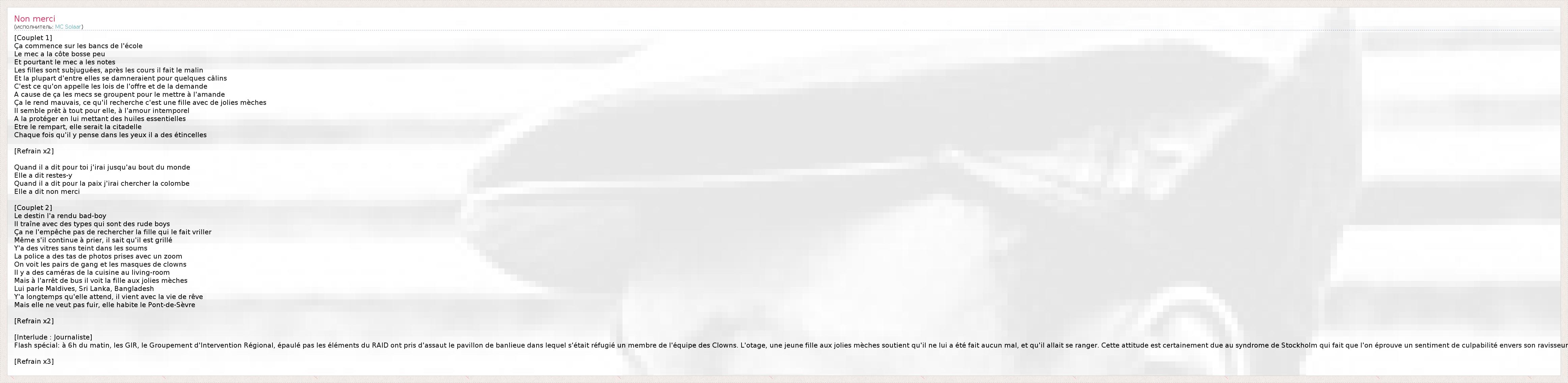 Это интересно:Во Франции существовали предпосылки появления такого стиля как рэп, ведь это страна трубадуров, которые славились богатствами языка и рифмы. Было необходимо лишь появление этого вдохновленного человека, который мог бы соединить свой талант со всей мощью поэтичного французского языка. По иронии судьбы этот человек появляется во Франции из Чада, минуя Сенегал. Он великолепно понимает... продолжение
