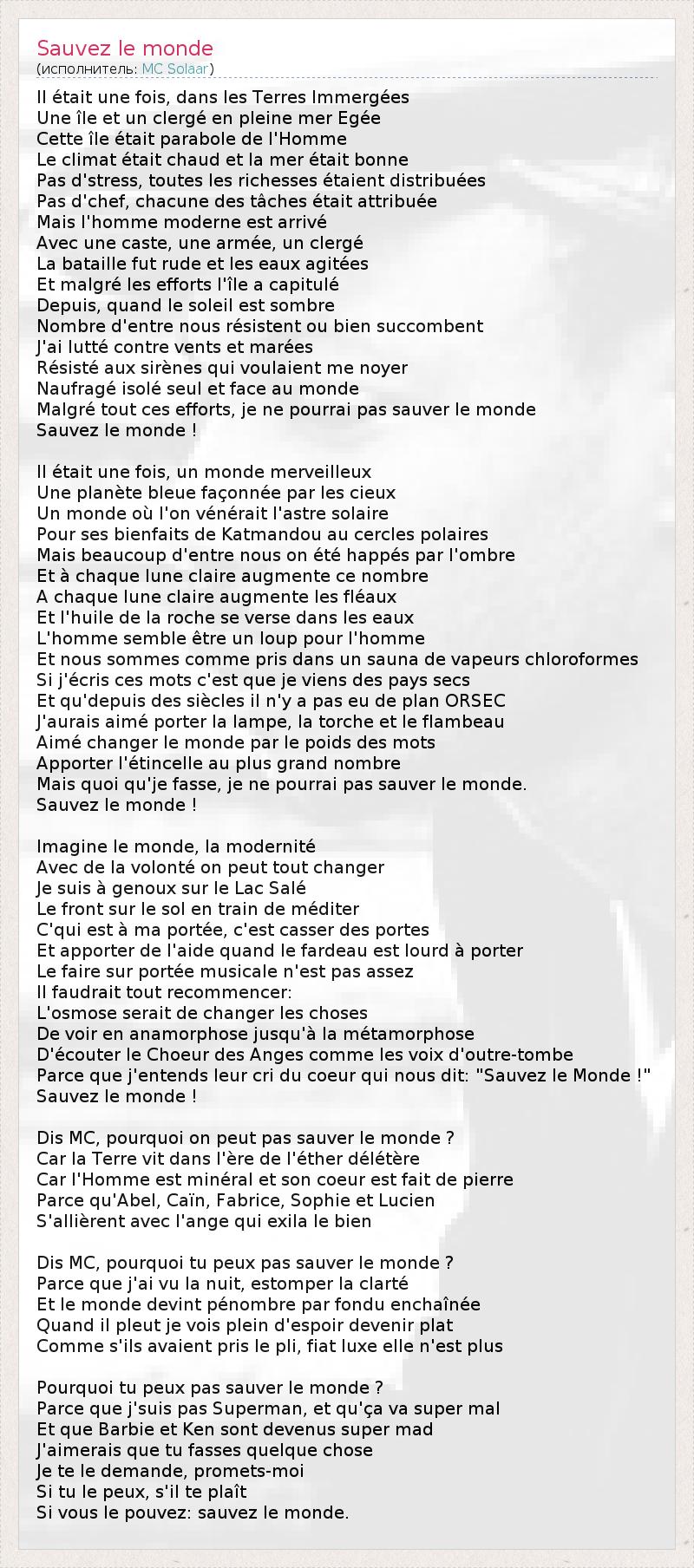 А как ты думаешь, о чем песня "Sauvez le monde" ?