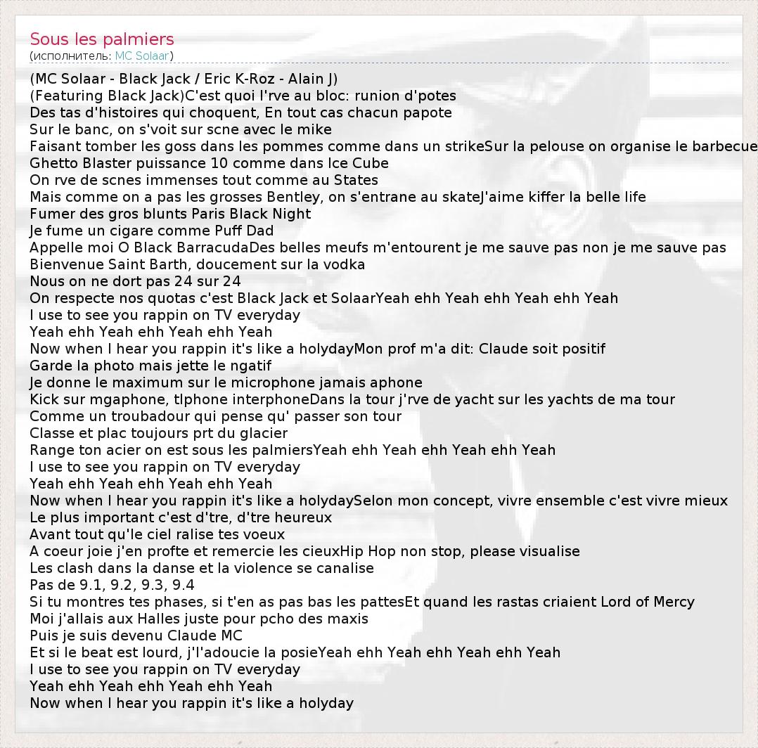 (MC Solaar - Black Jack / Eric K-Roz - Alain J) (Featuring Black Jack)C'est quoi l'rve au bloc: runion d'potes Des tas d'histoires qui choquent, En tout cas chacun papote Sur le banc, on s'voit sur scne avec le mike Faisant tomber les goss dans les pommes comme dans un strikeSur la pelouse on organise le barbecue Ghetto Blaster puissance 10 comme dans Ice Cube On rve de scnes immenses tout comme au States Mais comme on a pas les grosses Bentley, on s'entrane au skateJ'aime kiffer la belle life Fumer des gros blunts Paris Black Night Je fume un cigare comme Puff Dad Appelle moi O Black BarracudaDes belles meufs m'entourent je me sauve pas non je me sauve pas Bienvenue Saint Barth, doucement sur la vodka Nous on ne dort pas 24 sur 24 On respecte nos quotas c'est Black Jack et SolaarYeah ehh Yeah ehh Yeah ehh Yeah I use to see you rappin on TV everyday Yeah ehh Yeah ehh Yeah ehh Yeah Now when I hear you rappin it's like a holydayMon prof m'a dit: Claude soit positif Garde la photo mais jette le ngatif Je donne le maximum sur le microphone jamais aphone Kick sur mgaphone, tlphone interphoneDans la tour j'rve de yacht sur les yachts de ma tour Comme un troubadour qui pense qu' passer son tour Classe et plac toujours prt du glacier Range ton acier on est sous les palmiersYeah ehh Yeah ehh Yeah ehh Yeah I use to see you rappin on TV everyday Yeah ehh Yeah ehh Yeah ehh Yeah Now when I hear you rappin it's like a holydaySelon mon concept, vivre ensemble c'est vivre mieux Le plus important c'est d'tre, d'tre heureux Avant tout qu'le ciel ralise tes voeux A coeur joie j'en profte et remercie les cieuxHip Hop non stop, please visualise Les clash dans la danse et la violence se canalise Pas de 9.1, 9.2, 9.3, 9.4 Si tu montres tes phases, si t'en as pas bas les pattesEt quand les rastas criaient Lord of Mercy Moi j'allais aux Halles juste pour pcho des maxis Puis je suis devenu Claude MC Et si le beat est lourd, j'l'adoucie la posieYeah ehh Yeah ehh Yeah ehh Yeah I use to see you rappin on TV everyday Yeah ehh Yeah ehh Yeah ehh Yeah Now when I hear you rappin it's like a holyday