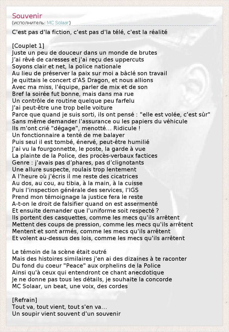 C'est pas d'la fiction, c'est pas d'la télé, c'est la réalité [Couplet 1] Juste un peu de douceur dans un monde de brutes J’ai rêvé de caresses et j'ai reçu des uppercuts Soyons clair et net, la police nationale Au lieu de préserver la paix sur moi a bâclé son travail Je quittais le concert d'AS Dragon, et nous allions Avec ma miss, l'équipe, parler de mix et de son Bref la soirée fut bonne, mais dans ma rue Un contrôle de routine quelque peu farfelu J'ai peut-être une trop belle voiture Parce que quand je suis sorti, ils ont pensé : "elle est volée, c'est sûr" Sans même demander l'assurance ou les papiers du véhicule Ils m'ont crié "dégage", menotté… Ridicule ! Un fonctionnaire a tenté de me balayer Puis seul il est tombé, énervé, peut-être humilié J'ai vu la fourgonnette, le poste, la garde à vue La plainte de la Police, des procès-verbaux factices Genre : j'avais pas d’phares, pas d’clignotants Une allure suspecte, roulais trop lentement A l'heure où j'écris il me reste des cicatrices Au dos, au cou, au tibia, à la main, à la cuisse Puis l'inspection générale des services, l'IGS Prend mon témoignage la justice fera le reste A-t-on le droit de falsifier quand on est assermenté Et ensuite demander que l'uniforme soit respecté ? Ils portent des casquettes, comme les mecs qu'ils arrêtent Mettent des coups de pression, comme les mecs qu'ils arrêtent Mentent et sont armés, comme les mecs qu'ils arrêtent Et volent au-dessus des lois, comme les mecs qu'ils arrêtent Le témoin de la scène était outré Mais des histoires similaires j'en ai des dizaines à te raconter Du fond du coeur "Peace" aux orphelins de la Police Ainsi qu'à ceux qui entendront ce chant anecdotique Je ne donne pas tous les détails, je souhaite la concorde MC Solaar, un beat, une voix, des cordes [Refrain] Tout va, tout vient, tout s'en va… Un soupir vient souvent d'un souvenir