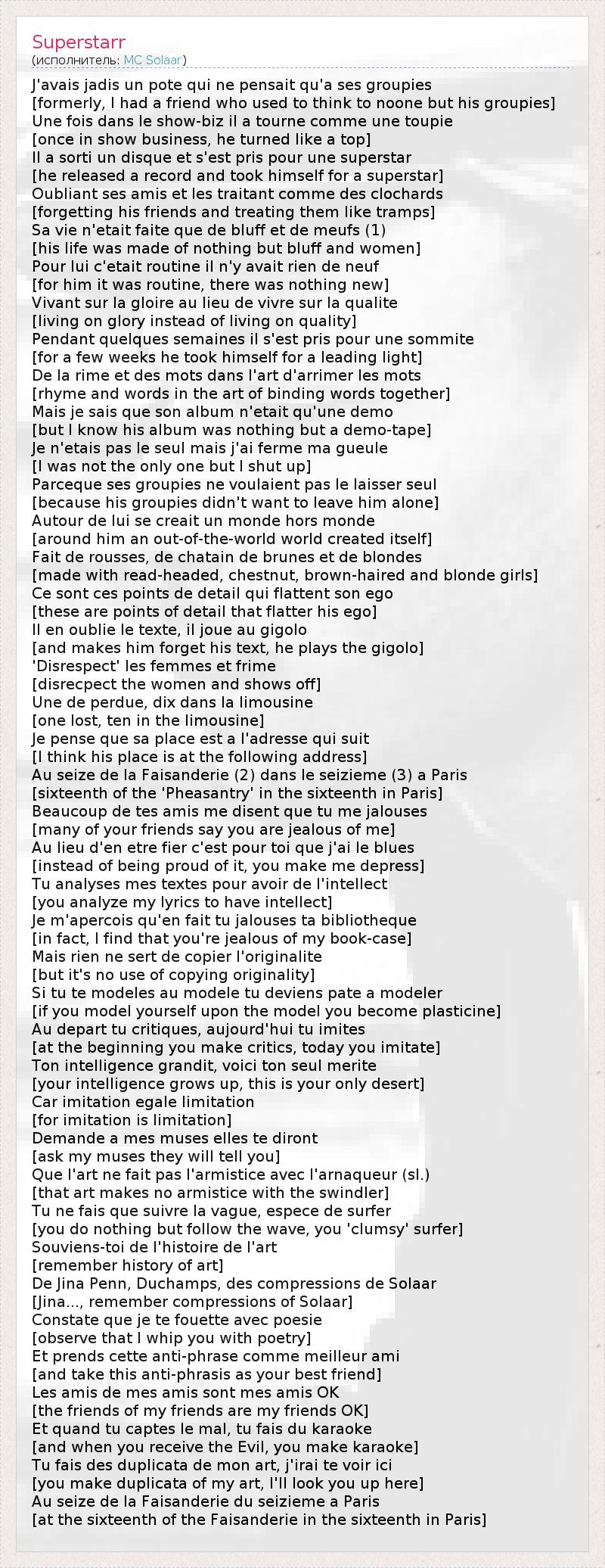 J'avais jadis un pote qui ne pensait qu'a ses groupies [formerly, I had a friend who used to think to noone but his groupies] Une fois dans le show-biz il a tourne comme une toupie [once in show business, he turned like a top] Il a sorti un disque et s'est pris pour une superstar [he released a record and took himself for a superstar] Oubliant ses amis et les traitant comme des clochards [forgetting his friends and treating them like tramps] Sa vie n'etait faite que de bluff et de meufs (1) [his life was made of nothing but bluff and women] Pour lui c'etait routine il n'y avait rien de neuf [for him it was routine, there was nothing new] Vivant sur la gloire au lieu de vivre sur la qualite [living on glory instead of living on quality] Pendant quelques semaines il s'est pris pour une sommite [for a few weeks he took himself for a leading light] De la rime et des mots dans l'art d'arrimer les mots [rhyme and words in the art of binding words together] Mais je sais que son album n'etait qu'une demo [but I know his album was nothing but a demo-tape] Je n'etais pas le seul mais j'ai ferme ma gueule [I was not the only one but I shut up] Parceque ses groupies ne voulaient pas le laisser seul [because his groupies didn't want to leave him alone] Autour de lui se creait un monde hors monde [around him an out-of-the-world world created itself] Fait de rousses, de chatain de brunes et de blondes [made with read-headed, chestnut, brown-haired and blonde girls] Ce sont ces points de detail qui flattent son ego [these are points of detail that flatter his ego] Il en oublie le texte, il joue au gigolo [and makes him forget his text, he plays the gigolo] 'Disrespect' les femmes et frime [disrecpect the women and shows off] Une de perdue, dix dans la limousine [one lost, ten in the limousine] Je pense que sa place est a l'adresse qui suit [I think his place is at the following address] Au seize de la Faisanderie (2) dans le seizieme (3) a Paris [sixteenth of the 'Pheasantry' in the sixteenth in Paris] Beaucoup de tes amis me disent que tu me jalouses [many of your friends say you are jealous of me] Au lieu d'en etre fier c'est pour toi que j'ai le blues [instead of being proud of it, you make me depress] Tu analyses mes textes pour avoir de l'intellect [you analyze my lyrics to have intellect] Je m'apercois qu'en fait tu jalouses ta bibliotheque [in fact, I find that you're jealous of my book-case] Mais rien ne sert de copier l'originalite [but it's no use of copying originality] Si tu te modeles au modele tu deviens pate a modeler [if you model yourself upon the model you become plasticine] Au depart tu critiques, aujourd'hui tu imites [at the beginning you make critics, today you imitate] Ton intelligence grandit, voici ton seul merite [your intelligence grows up, this is your only desert] Car imitation egale limitation [for imitation is limitation] Demande a mes muses elles te diront [ask my muses they will tell you] Que l'art ne fait pas l'armistice avec l'arnaqueur (sl.) [that art makes no armistice with the swindler] Tu ne fais que suivre la vague, espece de surfer [you do nothing but follow the wave, you 'clumsy' surfer] Souviens-toi de l'histoire de l'art [remember history of art] De Jina Penn, Duchamps, des compressions de Solaar [Jina..., remember compressions of Solaar] Constate que je te fouette avec poesie [observe that I whip you with poetry] Et prends cette anti-phrase comme meilleur ami [and take this anti-phrasis as your best friend] Les amis de mes amis sont mes amis OK [the friends of my friends are my friends OK] Et quand tu captes le mal, tu fais du karaoke [and when you receive the Evil, you make karaoke] Tu fais des duplicata de mon art, j'irai te voir ici [you make duplicata of my art, I'll look you up here] Au seize de la Faisanderie du seizieme a Paris [at the sixteenth of the Faisanderie in the sixteenth in Paris]