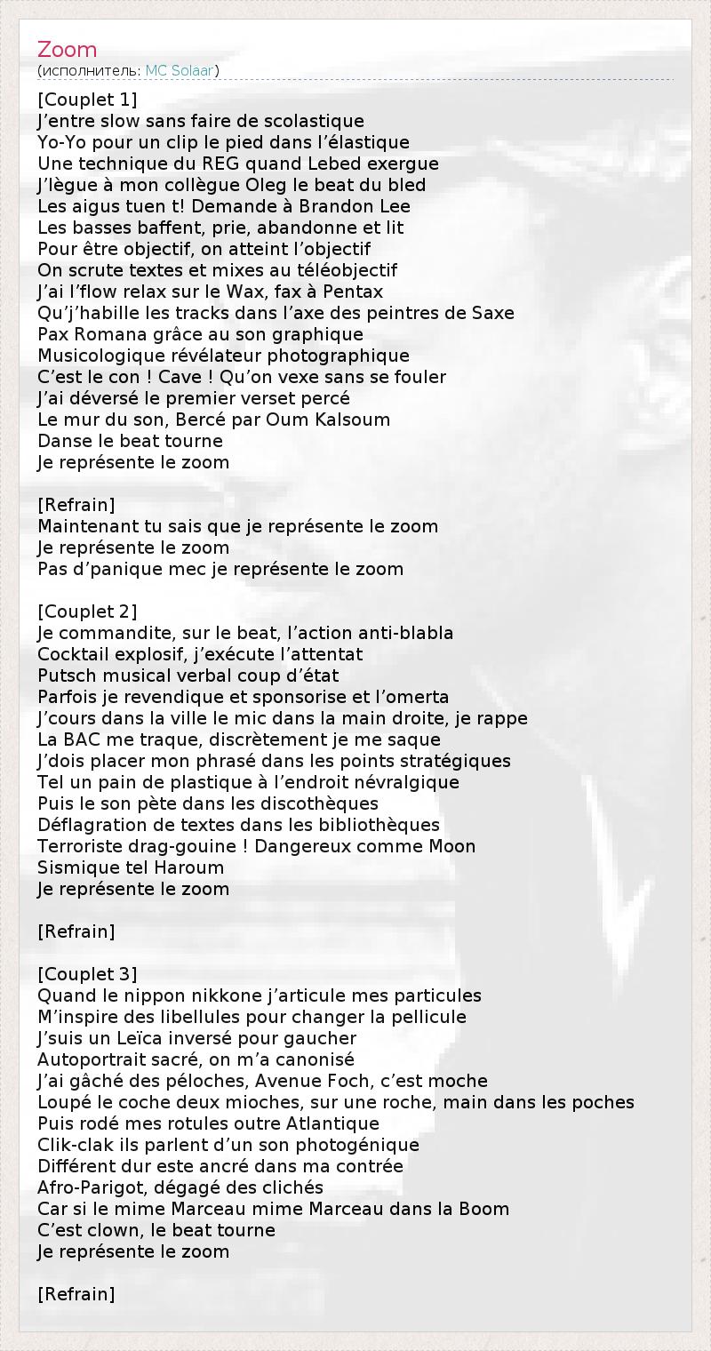 Это интересно:Во Франции существовали предпосылки появления такого стиля как рэп, ведь это страна трубадуров, которые славились богатствами языка и рифмы. Было необходимо лишь появление этого вдохновленного человека, который мог бы соединить свой талант со всей мощью поэтичного французского языка. По иронии судьбы этот человек появляется во Франции из Чада, минуя Сенегал. Он великолепно понимает... продолжение
