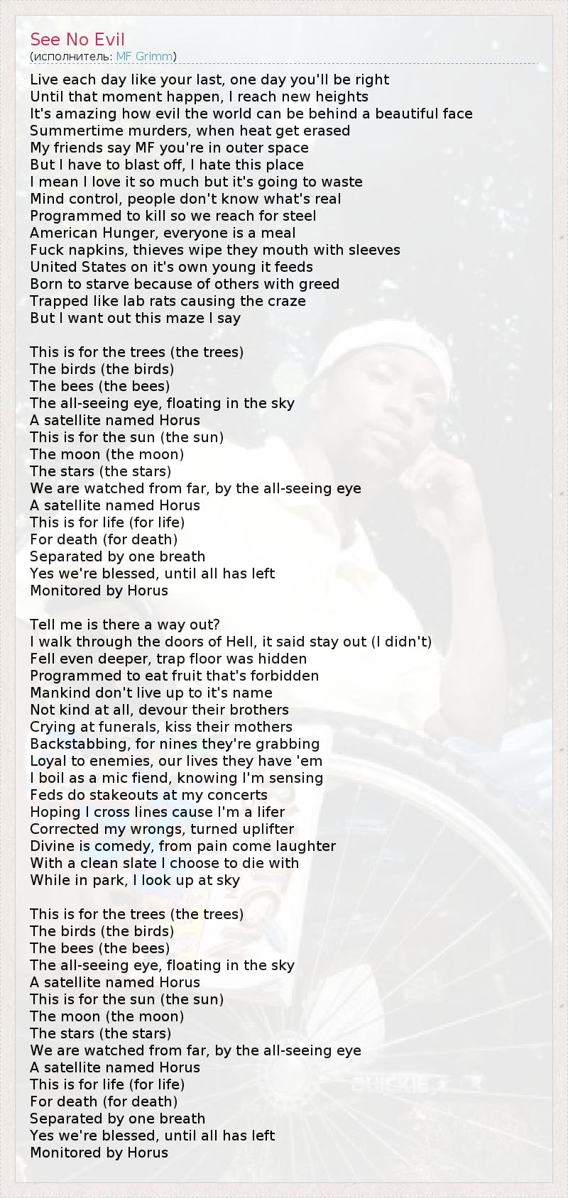 Live each day like your last, one day you'll be right Until that moment happen, I reach new heights It's amazing how evil the world can be behind a beautiful face Summertime murders, when heat get erased My friends say MF you're in outer space But I have to blast off, I hate this place I mean I love it so much but it's going to waste Mind control, people don't know what's real Programmed to kill so we reach for steel American Hunger, everyone is a meal Fuck napkins, thieves wipe they mouth with sleeves United States on it's own young it feeds Born to starve because of others with greed Trapped like lab rats causing the craze But I want out this maze I say This is for the trees (the trees) The birds (the birds) The bees (the bees) The all-seeing eye, floating in the sky A satellite named Horus This is for the sun (the sun) The moon (the moon) The stars (the stars) We are watched from far, by the all-seeing eye A satellite named Horus This is for life (for life) For death (for death) Separated by one breath Yes we're blessed, until all has left Monitored by Horus Tell me is there a way out? I walk through the doors of Hell, it said stay out (I didn't) Fell even deeper, trap floor was hidden Programmed to eat fruit that's forbidden Mankind don't live up to it's name Not kind at all, devour their brothers Crying at funerals, kiss their mothers Backstabbing, for nines they're grabbing Loyal to enemies, our lives they have 'em I boil as a mic fiend, knowing I'm sensing Feds do stakeouts at my concerts Hoping I cross lines cause I'm a lifer Corrected my wrongs, turned uplifter Divine is comedy, from pain come laughter With a clean slate I choose to die with While in park, I look up at sky This is for the trees (the trees) The birds (the birds) The bees (the bees) The all-seeing eye, floating in the sky A satellite named Horus This is for the sun (the sun) The moon (the moon) The stars (the stars) We are watched from far, by the all-seeing eye A satellite named Horus This is for life (for life) For death (for death) Separated by one breath Yes we're blessed, until all has left Monitored by Horus