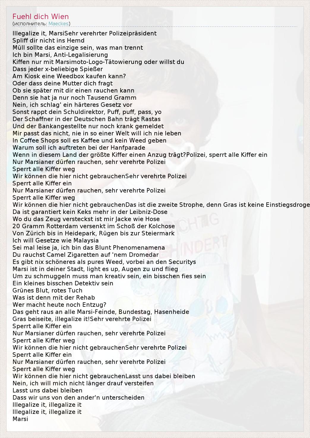 Illegalize it, MarsiSehr verehrter Polizeipräsident Spliff dir nicht ins Hemd Müll sollte das einzige sein, was man trennt Ich bin Marsi, Anti-Legalisierung Kiffen nur mit Marsimoto-Logo-Tätowierung oder willst du Dass jeder x-beliebige Spießer Am Kiosk eine Weedbox kaufen kann? Oder dass deine Mutter dich fragt Ob sie später mit dir einen rauchen kann Denn sie hat ja nur noch Tausend Gramm Nein, ich schlag' ein härteres Gesetz vor Sonst rappt dein Schuldirektor, Puff, puff, pass, yo Der Schaffner in der Deutschen Bahn trägt Rastas Und der Bankangestellte nur noch krank gemeldet Mir passt das nicht, nie in so einer Welt will ich nie leben In Coffee Shops soll es Kaffee und kein Weed geben Warum soll ich auftreten bei der Hanfparade Wenn in diesem Land der größte Kiffer einen Anzug trägt?Polizei, sperrt alle Kiffer ein Nur Marsianer dürfen rauchen, sehr verehrte Polizei Sperrt alle Kiffer weg Wir können die hier nicht gebrauchenSehr verehrte Polizei Sperrt alle Kiffer ein Nur Marsianer dürfen rauchen, sehr verehrte Polizei Sperrt alle Kiffer weg Wir können die hier nicht gebrauchenDas ist die zweite Strophe, denn Gras ist keine Einstiegsdroge Da ist garantiert kein Keks mehr in der Leibniz-Dose Wo du das Zeug versteckst ist mir Jacke wie Hose 20 Gramm Rotterdam versenkt im Schoß der Kolchose Von Zürich bis in Heidepark, Rügen bis zur Steiermark Ich will Gesetze wie Malaysia Sei mal leise ja, ich bin das Blunt Phenomenamena Du rauchst Camel Zigaretten auf 'nem Dromedar Es gibt nix schöneres als pures Weed, vorbei an den Securitys Marsi ist in deiner Stadt, light es up, Augen zu und flieg Um zu schmuggeln muss man kreativ sein, ein bisschen fies sein Ein kleines bisschen Detektiv sein Grünes Blut, rotes Tuch Was ist denn mit der Rehab Wer macht heute noch Entzug? Das geht raus an alle Marsi-Feinde, Bundestag, Hasenheide Gras beiseite, illegalize it!Sehr verehrte Polizei Sperrt alle Kiffer ein Nur Marsianer dürfen rauchen, sehr verehrte Polizei Sperrt alle Kiffer weg Wir können die hier nicht gebrauchenSehr verehrte Polizei Sperrt alle Kiffer ein Nur Marsianer dürfen rauchen, sehr verehrte Polizei Sperrt alle Kiffer weg Wir können die hier nicht gebrauchenLasst uns dabei bleiben Nein, ich will mich nicht länger drauf versteifen Lasst uns dabei bleiben Dass wir uns von den ander'n unterscheiden Illegalize it, illegalize it Illegalize it, illegalize it Marsi