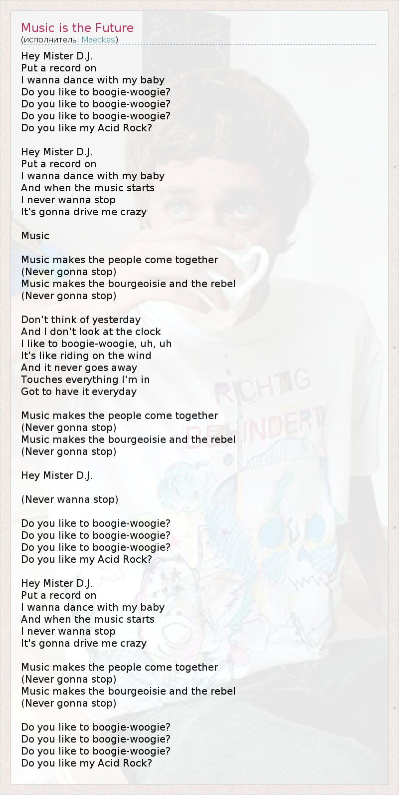 Эй, мистер Диджей, Нажми на кнопку, Я хочу танцевать со своим любимым. Тебе нравится буги-вуги? Тебе нравится буги-вуги? Тебе нравится буги-вуги? Тебе нравится мой кислотный рок? Эй, мистер Диджей, Нажми на кнопку, Я хочу потанцевать со своим любимым. И когда музыка начнётся, Я уже не смогу остановиться, Это сведёт меня с ума. Музыка Музыка сближает людей, (Никогда не останавливайся) Музыке поддаётся и король, и нищий. (Никогда не останавливайся) Не думай о вчерашнем дне, И я не буду смотреть на часы, Я люблю буги-вуги, Это похоже на полёт И это никогда не закончится, Оттянись по полной, Чтобы делать это каждый день. Музыка сближает людей, (Никогда не останавливайся) Музыке поддаётся и король, и нищий. (Никогда не останавливайся) Эй, мистер Диджей (Никогда не останавливайся) Тебе нравится буги-вуги? Тебе нравится буги-вуги? Тебе нравится буги-вуги? Тебе нравится мой кислотный рок? Эй, мистер Диджей, Нажми на кнопку, Я хочу потанцевать со своим любимым. И когда музыка начнётся, Я уже не смогу остановиться, Это сведёт меня с ума. Музыка сближает людей, (Никогда не останавливайся) Музыке поддаётся и король, и нищий. (Никогда не останавливайся) Тебе нравится буги-вуги? Тебе нравится буги-вуги? Тебе нравится буги-вуги? Тебе нравится мой кислотный рок?