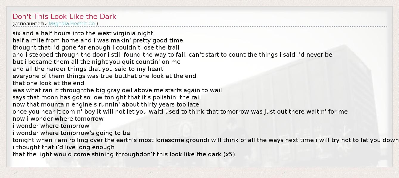 six and a half hours into the west virginia night half a mile from home and i was makin' pretty good time thought that i'd gone far enough i couldn't lose the trail and i stepped through the door i still found the way to faili can't start to count the things i said i'd never be but i became them all the night you quit countin' on me and all the harder things that you said to my heart everyone of them things was true butthat one look at the end that one look at the end was what ran it throughthe big gray owl above me starts again to wail says that moon has got so low tonight that it's polishin' the rail now that mountain engine's runnin' about thirty years too late once you hear it comin' boy it will not let you waiti used to think that tomorrow was just out there waitin' for me now i wonder where tomorrow i wonder where tomorrow i wonder where tomorrow's going to be tonight when i am rolling over the earth's most lonesome groundi will think of all the ways next time i will try not to let you down i thought that i'd live long enough that the light would come shining throughdon't this look like the dark (x5)