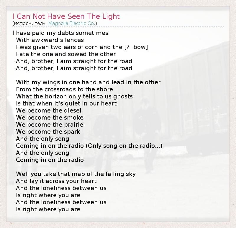 I have paid my debts sometimes With awkward silences I was given two ears of corn and the [? bow] I ate the one and sowed the other And, brother, I aim straight for the road And, brother, I aim straight for the road With my wings in one hand and lead in the other From the crossroads to the shore What the horizon only tells to us ghosts Is that when it's quiet in our heart We become the diesel We become the smoke We become the prairie We become the spark And the only song Coming in on the radio (Only song on the radio...) And the only song Coming in on the radio Well you take that map of the falling sky And lay it across your heart And the loneliness between us Is right where you are And the loneliness between us Is right where you are