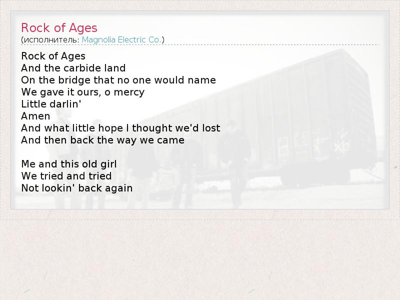 Rock of Ages And the carbide land On the bridge that no one would name We gave it ours, o mercy Little darlin' Amen And what little hope I thought we'd lost And then back the way we came Me and this old girl We tried and tried Not lookin' back again
