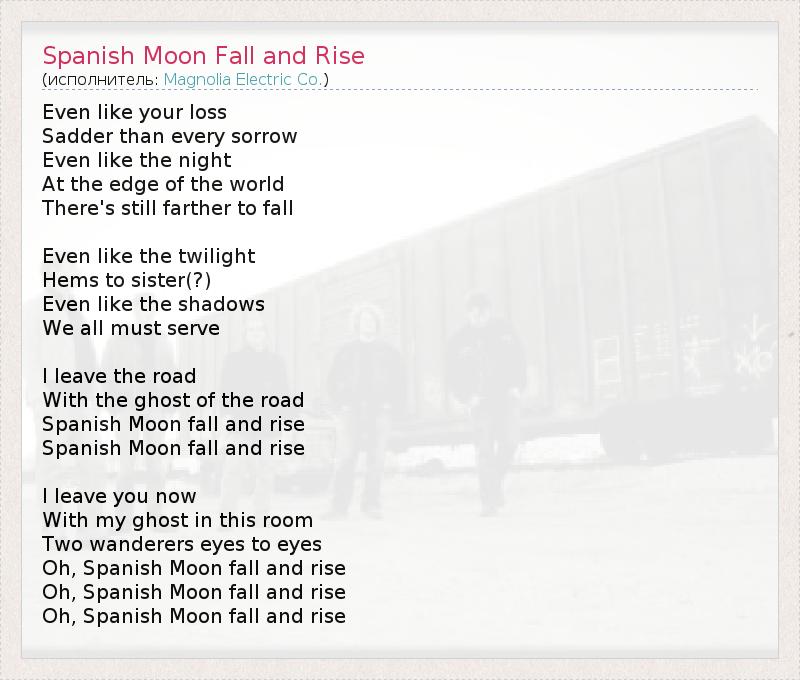 Even like your loss Sadder than every sorrow Even like the night At the edge of the world There's still farther to fall Even like the twilight Hems to sister(?) Even like the shadows We all must serve I leave the road With the ghost of the road Spanish Moon fall and rise Spanish Moon fall and rise I leave you now With my ghost in this room Two wanderers eyes to eyes Oh, Spanish Moon fall and rise Oh, Spanish Moon fall and rise Oh, Spanish Moon fall and rise