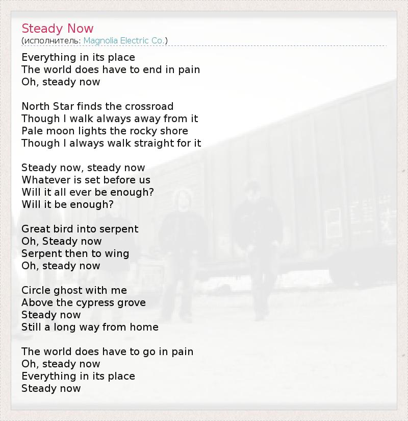 Everything in its place The world does have to end in pain Oh, steady now North Star finds the crossroad Though I walk always away from it Pale moon lights the rocky shore Though I always walk straight for it Steady now, steady now Whatever is set before us Will it all ever be enough? Will it be enough? Great bird into serpent Oh, Steady now Serpent then to wing Oh, steady now Circle ghost with me Above the cypress grove Steady now Still a long way from home The world does have to go in pain Oh, steady now Everything in its place Steady now