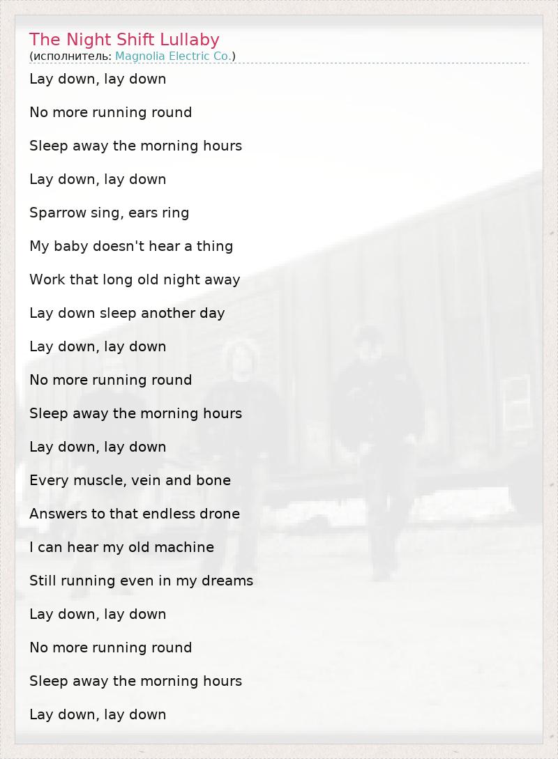 Lay down, lay down No more running round Sleep away the morning hours Lay down, lay down Sparrow sing, ears ring My baby doesn't hear a thing Work that long old night away Lay down sleep another day Lay down, lay down No more running round Sleep away the morning hours Lay down, lay down Every muscle, vein and bone Answers to that endless drone I can hear my old machine Still running even in my dreams Lay down, lay down No more running round Sleep away the morning hours Lay down, lay down