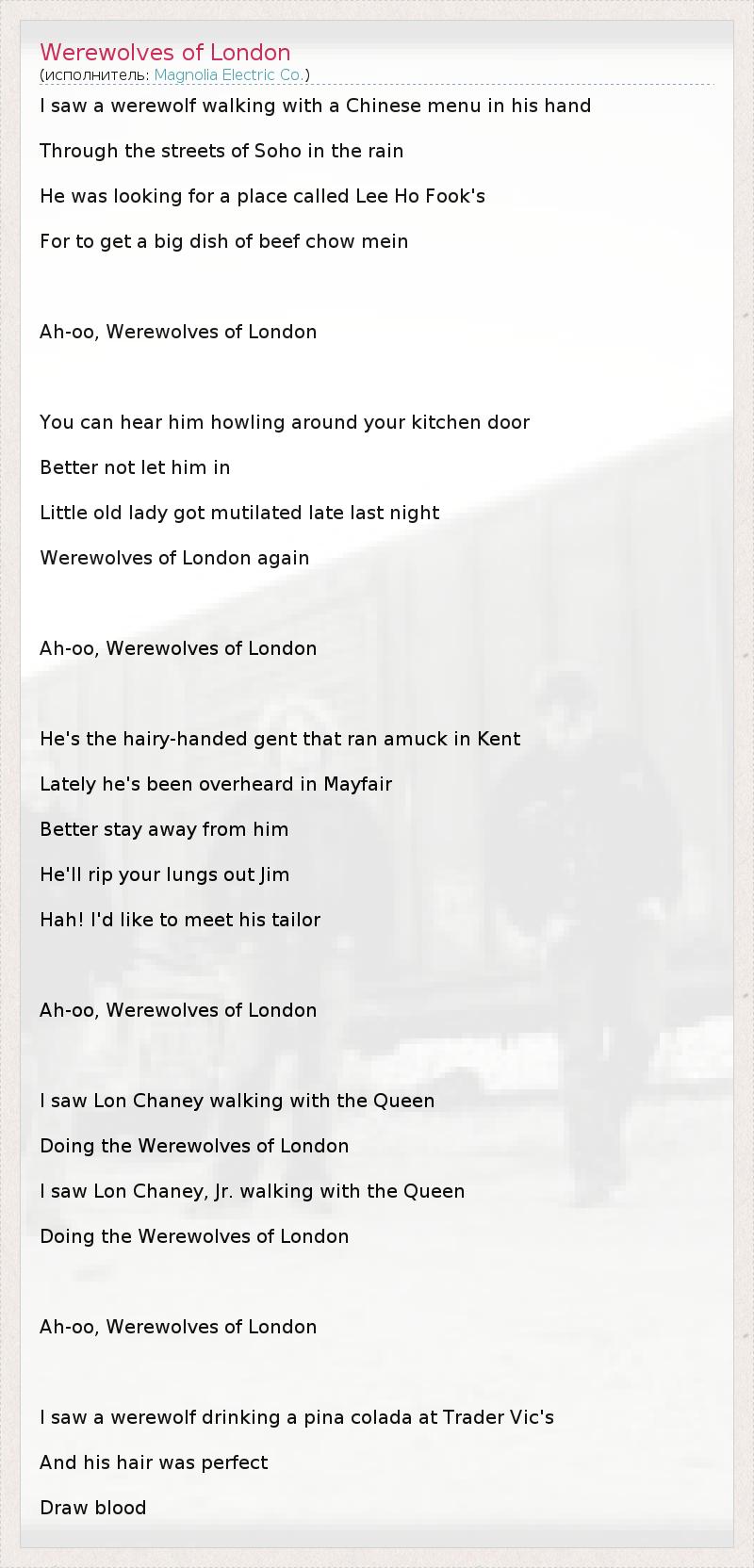I saw a werewolf walking with a Chinese menu in his hand Through the streets of Soho in the rain He was looking for a place called Lee Ho Fook's For to get a big dish of beef chow mein Ah-oo, Werewolves of London You can hear him howling around your kitchen door Better not let him in Little old lady got mutilated late last night Werewolves of London again Ah-oo, Werewolves of London He's the hairy-handed gent that ran amuck in Kent Lately he's been overheard in Mayfair Better stay away from him He'll rip your lungs out Jim Hah! I'd like to meet his tailor Ah-oo, Werewolves of London I saw Lon Chaney walking with the Queen Doing the Werewolves of London I saw Lon Chaney, Jr. walking with the Queen Doing the Werewolves of London Ah-oo, Werewolves of London I saw a werewolf drinking a pina colada at Trader Vic's And his hair was perfect Draw blood