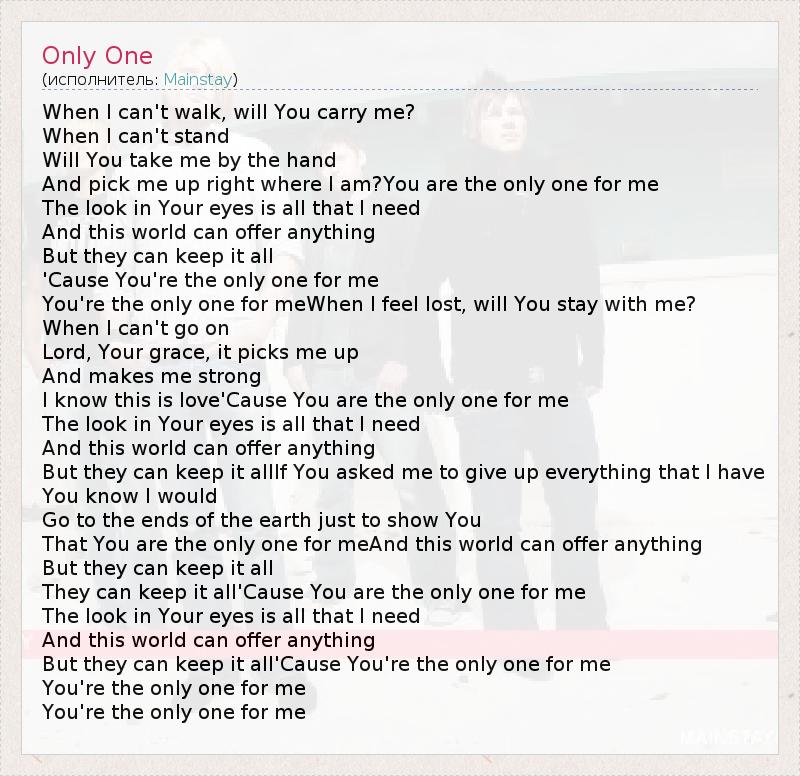 When I can't walk, will You carry me? When I can't stand Will You take me by the hand And pick me up right where I am?You are the only one for me The look in Your eyes is all that I need And this world can offer anything But they can keep it all 'Cause You're the only one for me You're the only one for meWhen I feel lost, will You stay with me? When I can't go on Lord, Your grace, it picks me up And makes me strong I know this is love'Cause You are the only one for me The look in Your eyes is all that I need And this world can offer anything But they can keep it allIf You asked me to give up everything that I have You know I would Go to the ends of the earth just to show You That You are the only one for meAnd this world can offer anything But they can keep it all They can keep it all'Cause You are the only one for me The look in Your eyes is all that I need And this world can offer anything But they can keep it all'Cause You're the only one for me You're the only one for me You're the only one for me