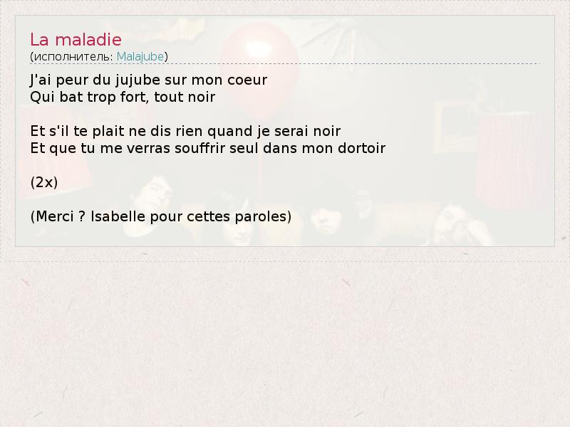 J'ai peur du jujube sur mon coeur Qui bat trop fort, tout noir Et s'il te plait ne dis rien quand je serai noir Et que tu me verras souffrir seul dans mon dortoir (2x) (Merci ? Isabelle pour cettes paroles)