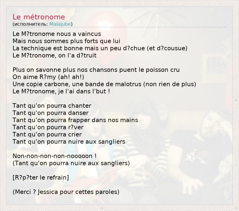 Le M?tronome nous a vaincus Mais nous sommes plus forts que lui La technique est bonne mais un peu d?chue (et d?cousue) Le M?tronome, on l'a d?truit Plus on savonne plus nos chansons puent le poisson cru On aime R?my (ah! ah!) Une copie carbone, une bande de malotrus (non rien de plus) Le M?tronome, je l'ai dans l'but ! Tant qu'on pourra chanter Tant qu'on pourra danser Tant qu'on pourra frapper dans nos mains Tant qu'on pourra r?ver Tant qu'on pourra crier Tant qu'on pourra nuire aux sangliers Non-non-non-non-nooooon ! (Tant qu'on pourra nuire aux sangliers) [R?p?ter le refrain] (Merci ? Jessica pour cettes paroles)