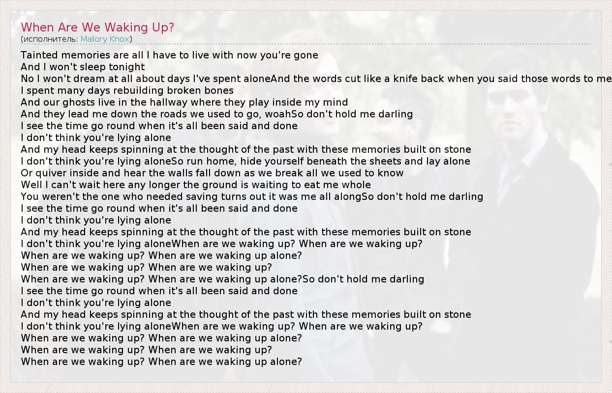 Tainted memories are all I have to live with now you're gone And I won't sleep tonight No I won't dream at all about days I've spent aloneAnd the words cut like a knife back when you said those words to me I spent many days rebuilding broken bones And our ghosts live in the hallway where they play inside my mind And they lead me down the roads we used to go, woahSo don't hold me darling I see the time go round when it's all been said and done I don't think you're lying alone And my head keeps spinning at the thought of the past with these memories built on stone I don't think you're lying aloneSo run home, hide yourself beneath the sheets and lay alone Or quiver inside and hear the walls fall down as we break all we used to know Well I can't wait here any longer the ground is waiting to eat me whole You weren't the one who needed saving turns out it was me all alongSo don't hold me darling I see the time go round when it's all been said and done I don't think you're lying alone And my head keeps spinning at the thought of the past with these memories built on stone I don't think you're lying aloneWhen are we waking up? When are we waking up? When are we waking up? When are we waking up alone? When are we waking up? When are we waking up? When are we waking up? When are we waking up alone?So don't hold me darling I see the time go round when it's all been said and done I don't think you're lying alone And my head keeps spinning at the thought of the past with these memories built on stone I don't think you're lying aloneWhen are we waking up? When are we waking up? When are we waking up? When are we waking up alone? When are we waking up? When are we waking up? When are we waking up? When are we waking up alone?