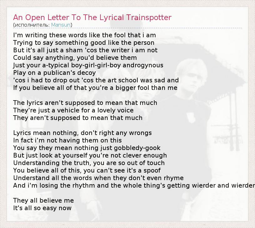 А как ты думаешь, о чем песня "An Open Letter To The Lyrical Trainspotter" ?