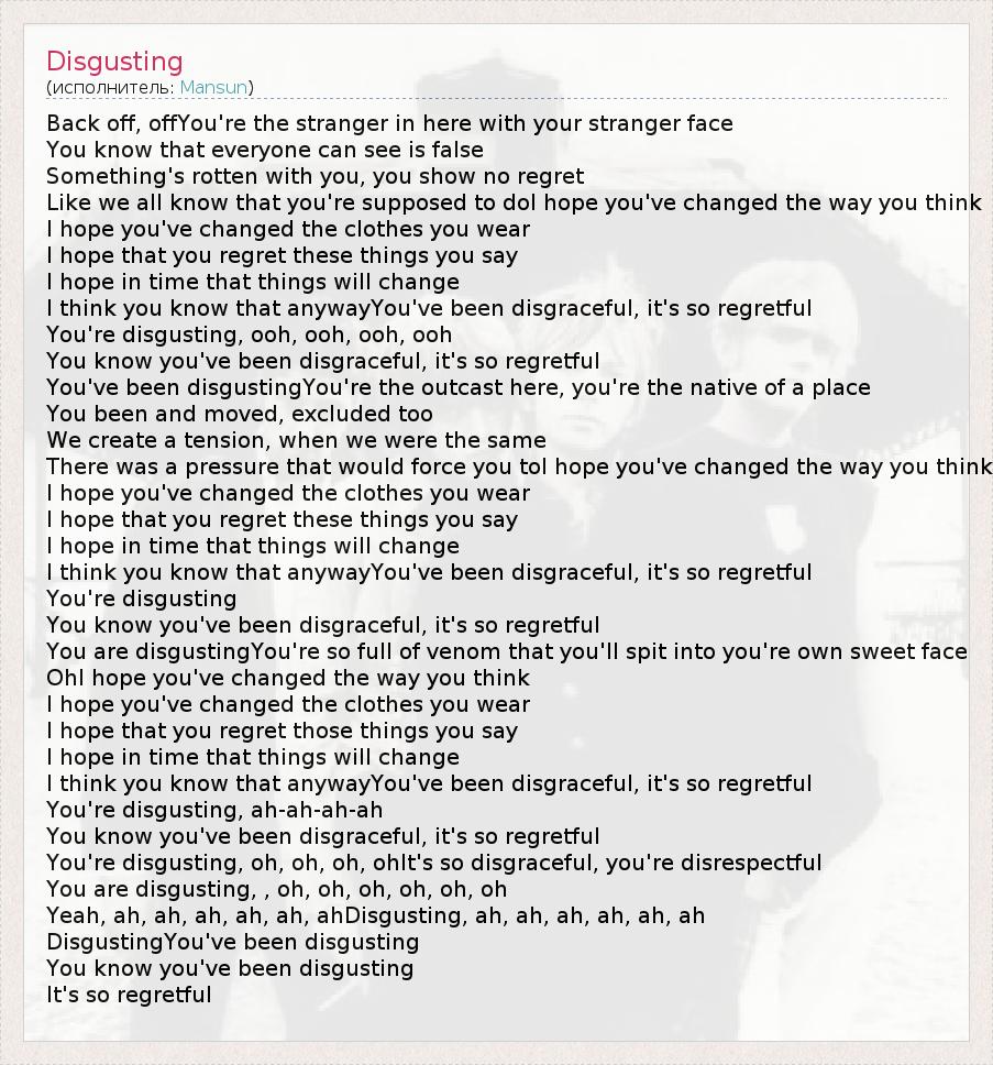 Back off, offYou're the stranger in here with your stranger face You know that everyone can see is false Something's rotten with you, you show no regret Like we all know that you're supposed to doI hope you've changed the way you think I hope you've changed the clothes you wear I hope that you regret these things you say I hope in time that things will change I think you know that anywayYou've been disgraceful, it's so regretful You're disgusting, ooh, ooh, ooh, ooh You know you've been disgraceful, it's so regretful You've been disgustingYou're the outcast here, you're the native of a place You been and moved, excluded too We create a tension, when we were the same There was a pressure that would force you toI hope you've changed the way you think I hope you've changed the clothes you wear I hope that you regret these things you say I hope in time that things will change I think you know that anywayYou've been disgraceful, it's so regretful You're disgusting You know you've been disgraceful, it's so regretful You are disgustingYou're so full of venom that you'll spit into you're own sweet face OhI hope you've changed the way you think I hope you've changed the clothes you wear I hope that you regret those things you say I hope in time that things will change I think you know that anywayYou've been disgraceful, it's so regretful You're disgusting, ah-ah-ah-ah You know you've been disgraceful, it's so regretful You're disgusting, oh, oh, oh, ohIt's so disgraceful, you're disrespectful You are disgusting, , oh, oh, oh, oh, oh, oh Yeah, ah, ah, ah, ah, ah, ahDisgusting, ah, ah, ah, ah, ah, ah DisgustingYou've been disgusting You know you've been disgusting It's so regretful