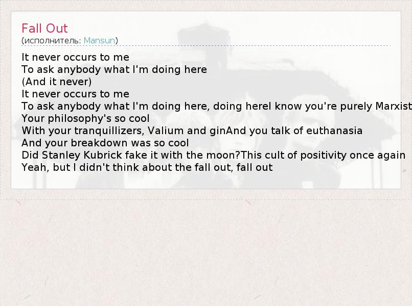 Это интересно:МЭНСАН (Mansun), английская брит-поп-группа. Основана в 1995 в г. Честер (недалеко от Ливерпуля).Основатели группы Пол Дрэпер (Paul Draper, вокал, гитара) и Стоув Кинг (Stove King, бас) познакомились в Ливерпульском художественном колледже. Оба любили DURAN DURAN, Дэвида Боуи и PINK FLOYD. Пол, сочинявший песни с 11 лет, немного играл на акустической гитаре, а Стоув начал осваивать бас-гитару только после того, как... продолжение
