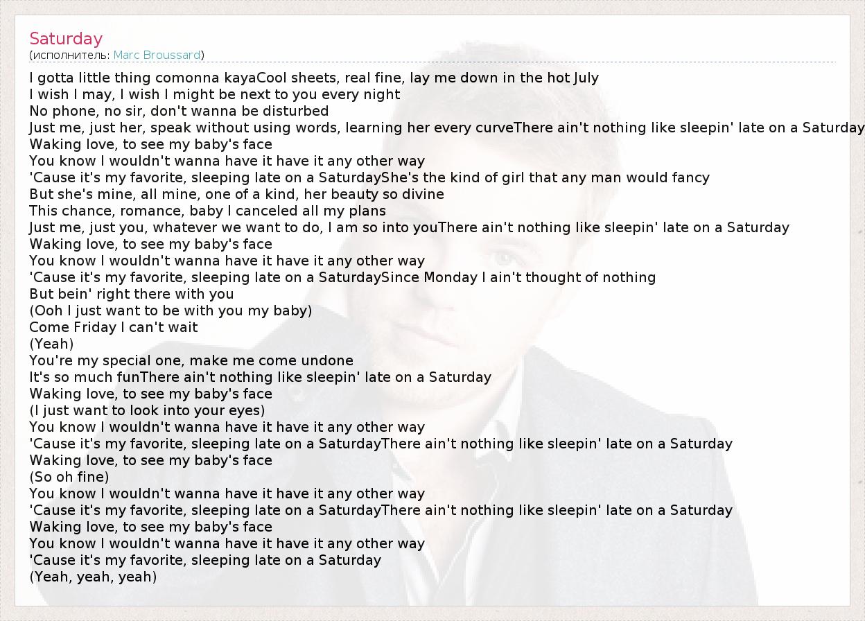 'Cause it's my favorite, sleeping late on a SaturdayThere ain't nothing like sleepin' late on a Saturday