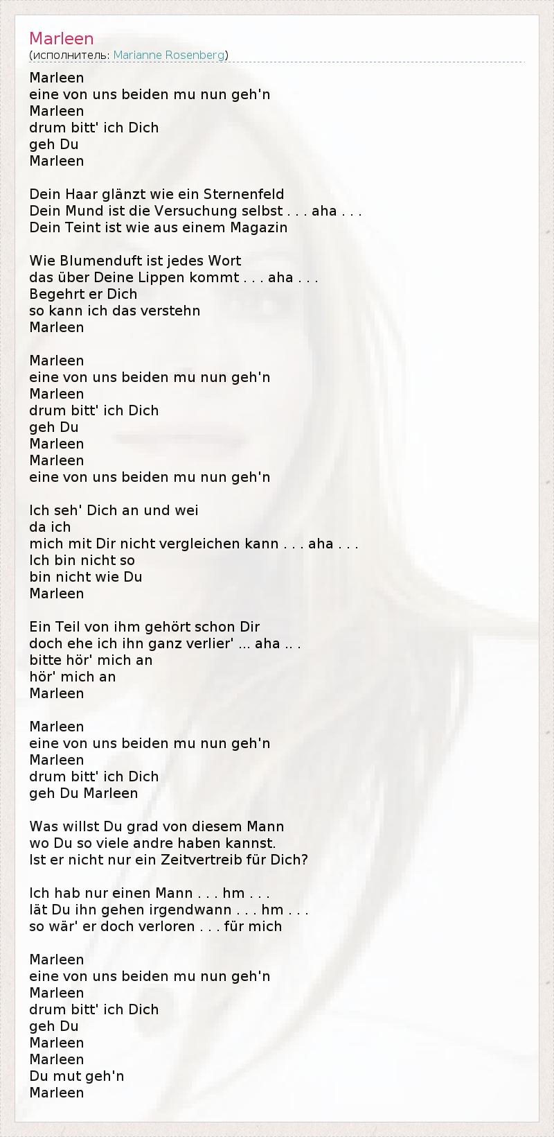 Marleen eine von uns beiden mu nun geh'n Marleen drum bitt' ich Dich geh Du Marleen Dein Haar glänzt wie ein Sternenfeld Dein Mund ist die Versuchung selbst . . . aha . . . Dein Teint ist wie aus einem Magazin Wie Blumenduft ist jedes Wort das über Deine Lippen kommt . . . aha . . . Begehrt er Dich so kann ich das verstehn Marleen Marleen eine von uns beiden mu nun geh'n Marleen drum bitt' ich Dich geh Du Marleen Marleen eine von uns beiden mu nun geh'n Ich seh' Dich an und wei da ich mich mit Dir nicht vergleichen kann . . . aha . . . Ich bin nicht so bin nicht wie Du Marleen Ein Teil von ihm gehört schon Dir doch ehe ich ihn ganz verlier' ... aha .. . bitte hör' mich an hör' mich an Marleen Marleen eine von uns beiden mu nun geh'n Marleen drum bitt' ich Dich geh Du Marleen Was willst Du grad von diesem Mann wo Du so viele andre haben kannst. Ist er nicht nur ein Zeitvertreib für Dich? Ich hab nur einen Mann . . . hm . . . Iät Du ihn gehen irgendwann . . . hm . . . so wär' er doch verloren . . . für mich Marleen eine von uns beiden mu nun geh'n Marleen drum bitt' ich Dich geh Du Marleen Marleen Du mut geh'n Marleen