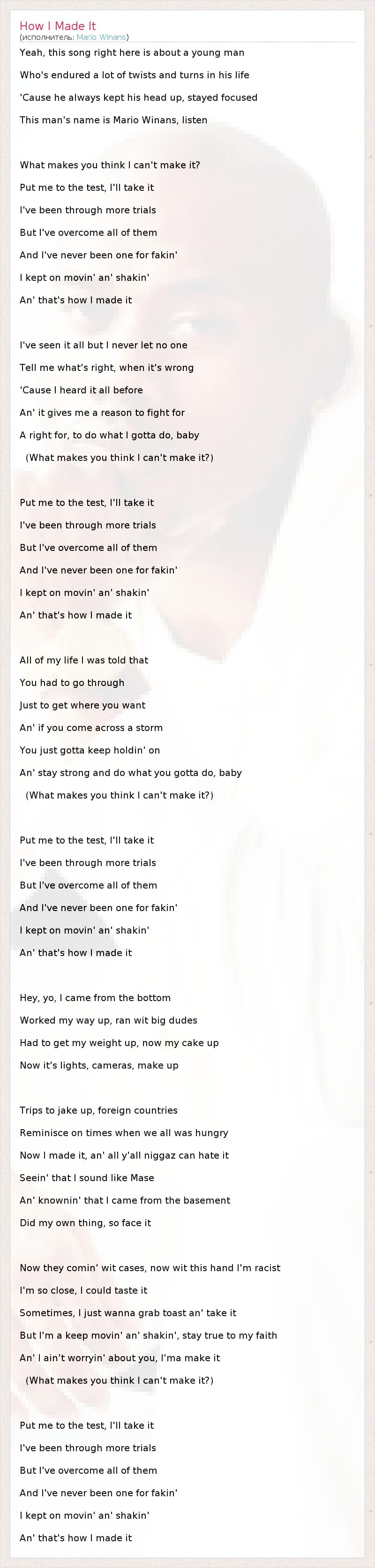 Это интересно:Певец, музыкант, композитор Mario Winans — единственный не gospel артист из знаменитой семьи Winans. Свой дебютный альбом «Story of My Heart» он записал еще в 1997 году, но всемирную славу принес ему альбом 2004 года «Hurt No More».