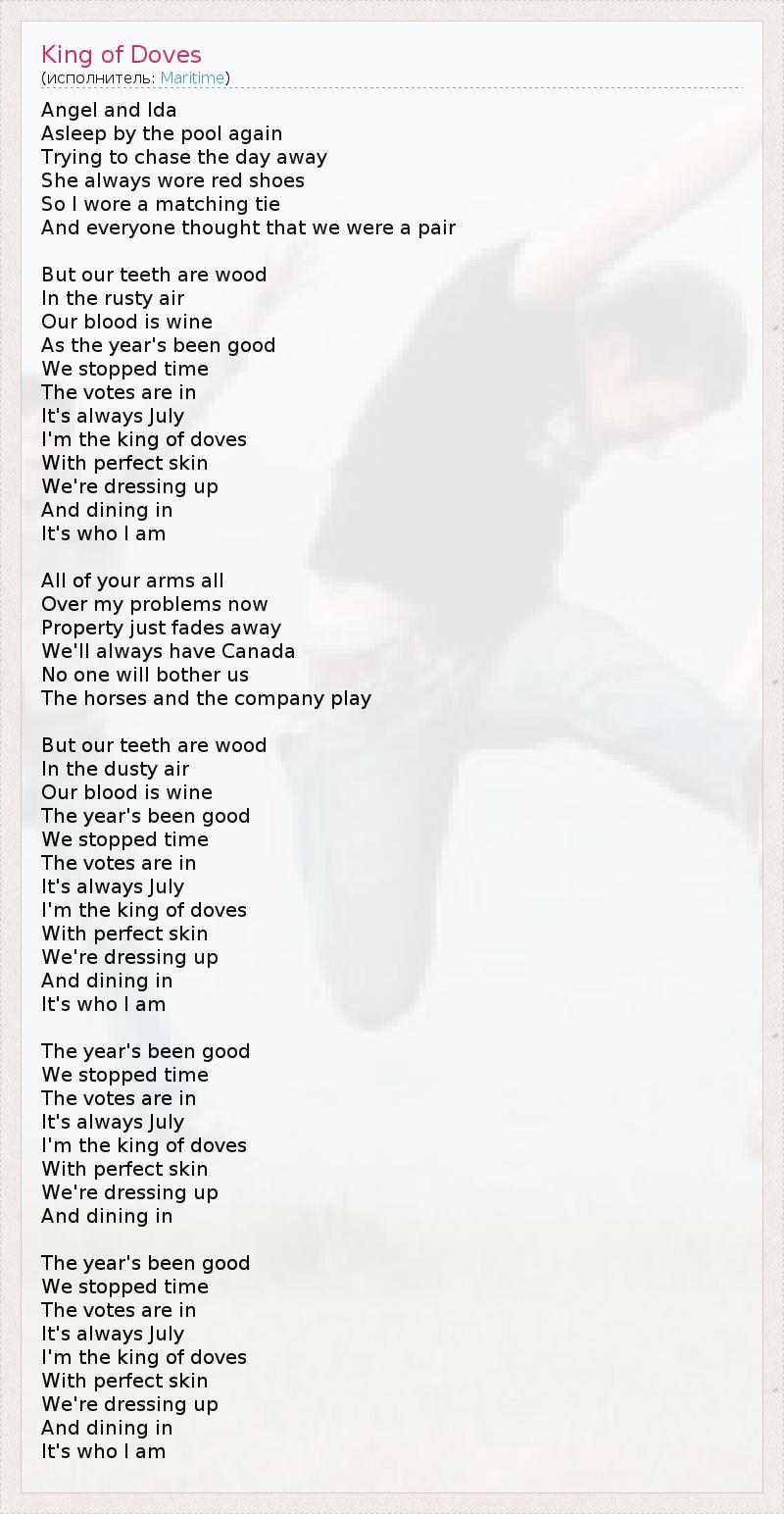 Это интересно:Maritime была образована в 2003 году из бывших коллективов The Primise Ring и The Dismemberment Plan. После того, как эти две группы распались, солист/гитарист Дэви фон Болен (Davey von Bohlen), барабанщик Дан Дидир (Dan Didier) (из группы The Promise Ring) и бассист Эрик Акелсон (Eric Axelson) (из The Dismemberment Plan) познакомились друг с другом и создали другую группу, которую назвали In English. Эта группа подписала договор со звукозаписывающей компанией... продолжение