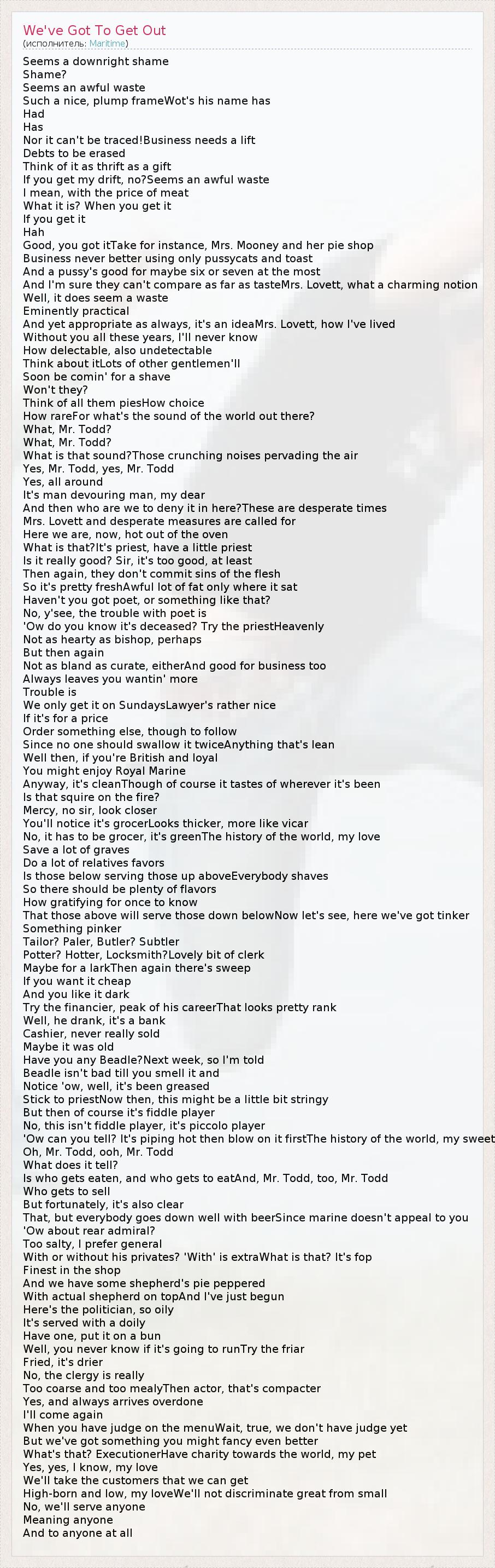 Seems a downright shame Shame? Seems an awful waste Such a nice, plump frameWot's his name has Had Has Nor it can't be traced!Business needs a lift Debts to be erased Think of it as thrift as a gift If you get my drift, no?Seems an awful waste I mean, with the price of meat What it is? When you get it If you get it Hah Good, you got itTake for instance, Mrs. Mooney and her pie shop Business never better using only pussycats and toast And a pussy's good for maybe six or seven at the most And I'm sure they can't compare as far as tasteMrs. Lovett, what a charming notion Well, it does seem a waste Eminently practical And yet appropriate as always, it's an ideaMrs. Lovett, how I've lived Without you all these years, I'll never know How delectable, also undetectable Think about itLots of other gentlemen'll Soon be comin' for a shave Won't they? Think of all them piesHow choice How rareFor what's the sound of the world out there? What, Mr. Todd? What, Mr. Todd? What is that sound?Those crunching noises pervading the air Yes, Mr. Todd, yes, Mr. Todd Yes, all around It's man devouring man, my dear And then who are we to deny it in here?These are desperate times Mrs. Lovett and desperate measures are called for Here we are, now, hot out of the oven What is that?It's priest, have a little priest Is it really good? Sir, it's too good, at least Then again, they don't commit sins of the flesh So it's pretty freshAwful lot of fat only where it sat Haven't you got poet, or something like that? No, y'see, the trouble with poet is 'Ow do you know it's deceased? Try the priestHeavenly Not as hearty as bishop, perhaps But then again Not as bland as curate, eitherAnd good for business too Always leaves you wantin' more Trouble is We only get it on SundaysLawyer's rather nice If it's for a price Order something else, though to follow Since no one should swallow it twiceAnything that's lean Well then, if you're British and loyal You might enjoy Royal Marine Anyway, it's cleanThough of course it tastes of wherever it's been Is that squire on the fire? Mercy, no sir, look closer You'll notice it's grocerLooks thicker, more like vicar No, it has to be grocer, it's greenThe history of the world, my love Save a lot of graves Do a lot of relatives favors Is those below serving those up aboveEverybody shaves So there should be plenty of flavors How gratifying for once to know That those above will serve those down belowNow let's see, here we've got tinker Something pinker Tailor? Paler, Butler? Subtler Potter? Hotter, Locksmith?Lovely bit of clerk Maybe for a larkThen again there's sweep If you want it cheap And you like it dark Try the financier, peak of his careerThat looks pretty rank Well, he drank, it's a bank Cashier, never really sold Maybe it was old Have you any Beadle?Next week, so I'm told Beadle isn't bad till you smell it and Notice 'ow, well, it's been greased Stick to priestNow then, this might be a little bit stringy But then of course it's fiddle player No, this isn't fiddle player, it's piccolo player 'Ow can you tell? It's piping hot then blow on it firstThe history of the world, my sweet Oh, Mr. Todd, ooh, Mr. Todd What does it tell? Is who gets eaten, and who gets to eatAnd, Mr. Todd, too, Mr. Todd Who gets to sell But fortunately, it's also clear That, but everybody goes down well with beerSince marine doesn't appeal to you 'Ow about rear admiral? Too salty, I prefer general With or without his privates? 'With' is extraWhat is that? It's fop Finest in the shop And we have some shepherd's pie peppered With actual shepherd on topAnd I've just begun Here's the politician, so oily It's served with a doily Have one, put it on a bun Well, you never know if it's going to runTry the friar Fried, it's drier No, the clergy is really Too coarse and too mealyThen actor, that's compacter Yes, and always arrives overdone I'll come again When you have judge on the menuWait, true, we don't have judge yet But we've got something you might fancy even better What's that? ExecutionerHave charity towards the world, my pet Yes, yes, I know, my love We'll take the customers that we can get High-born and low, my loveWe'll not discriminate great from small No, we'll serve anyone Meaning anyone And to anyone at all