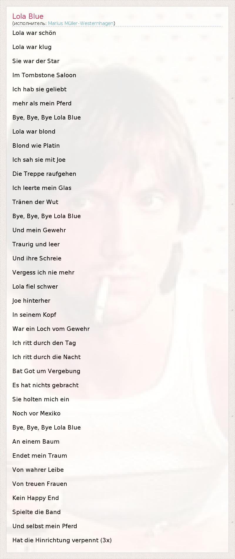 Lola war schön Lola war klug Sie war der Star Im Tombstone Saloon Ich hab sie geliebt mehr als mein Pferd Bye, Bye, Bye Lola Blue Lola war blond Blond wie Platin Ich sah sie mit Joe Die Treppe raufgehen Ich leerte mein Glas Tränen der Wut Bye, Bye, Bye Lola Blue Und mein Gewehr Traurig und leer Und ihre Schreie Vergess ich nie mehr Lola fiel schwer Joe hinterher In seinem Kopf War ein Loch vom Gewehr Ich ritt durch den Tag Ich ritt durch die Nacht Bat Got um Vergebung Es hat nichts gebracht Sie holten mich ein Noch vor Mexiko Bye, Bye, Bye Lola Blue An einem Baum Endet mein Traum Von wahrer Leibe Von treuen Frauen Kein Happy End Spielte die Band Und selbst mein Pferd Hat die Hinrichtung verpennt (3x)
