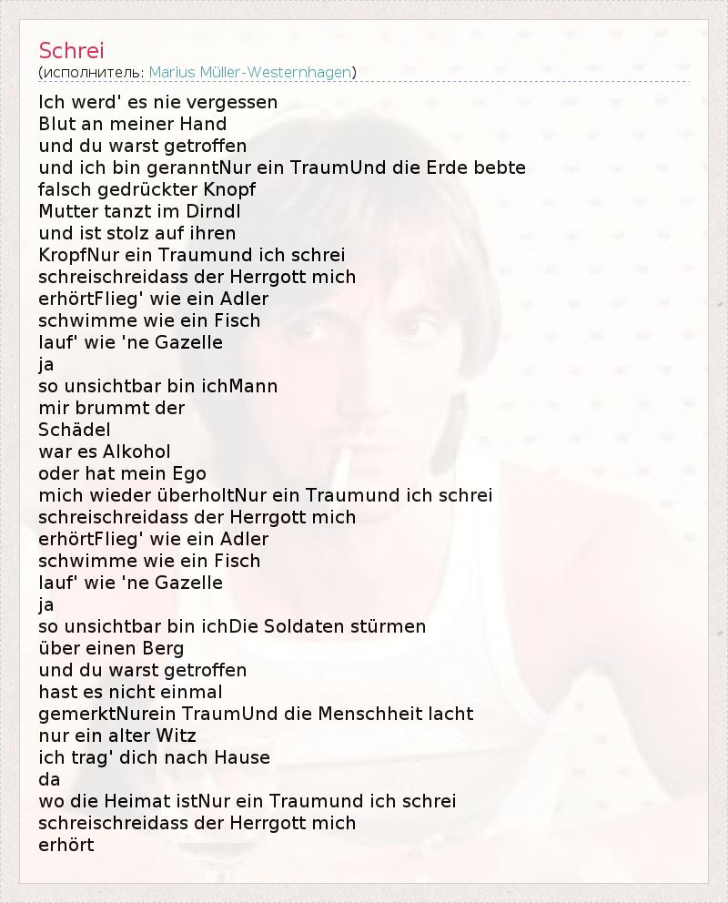 Ich werd' es nie vergessen Blut an meiner Hand und du warst getroffen und ich bin geranntNur ein TraumUnd die Erde bebte falsch gedrückter Knopf Mutter tanzt im Dirndl und ist stolz auf ihren KropfNur ein Traumund ich schrei schreischreidass der Herrgott mich erhörtFlieg' wie ein Adler schwimme wie ein Fisch lauf' wie 'ne Gazelle ja so unsichtbar bin ichMann mir brummt der Schädel war es Alkohol oder hat mein Ego mich wieder überholtNur ein Traumund ich schrei schreischreidass der Herrgott mich erhörtFlieg' wie ein Adler schwimme wie ein Fisch lauf' wie 'ne Gazelle ja so unsichtbar bin ichDie Soldaten stürmen über einen Berg und du warst getroffen hast es nicht einmal gemerktNurein TraumUnd die Menschheit lacht nur ein alter Witz ich trag' dich nach Hause da wo die Heimat istNur ein Traumund ich schrei schreischreidass der Herrgott mich erhört