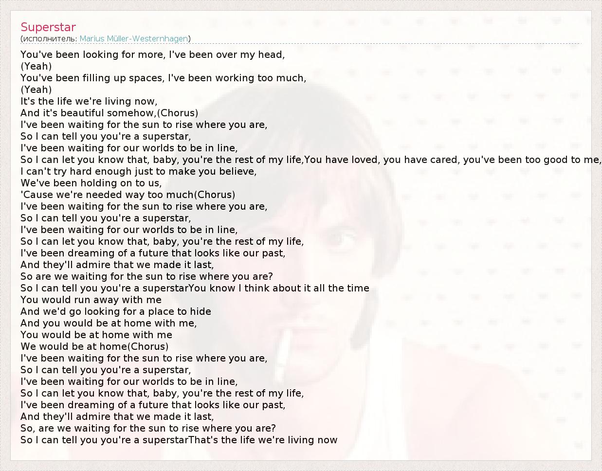 You've been looking for more, I've been over my head, (Yeah) You've been filling up spaces, I've been working too much, (Yeah) It's the life we're living now, And it's beautiful somehow,(Chorus) I've been waiting for the sun to rise where you are, So I can tell you you're a superstar, I've been waiting for our worlds to be in line, So I can let you know that, baby, you're the rest of my life,You have loved, you have cared, you've been too good to me, I can't try hard enough just to make you believe, We've been holding on to us, 'Cause we're needed way too much(Chorus) I've been waiting for the sun to rise where you are, So I can tell you you're a superstar, I've been waiting for our worlds to be in line, So I can let you know that, baby, you're the rest of my life, I've been dreaming of a future that looks like our past, And they'll admire that we made it last, So are we waiting for the sun to rise where you are? So I can tell you you're a superstarYou know I think about it all the time You would run away with me And we'd go looking for a place to hide And you would be at home with me, You would be at home with me We would be at home(Chorus) I've been waiting for the sun to rise where you are, So I can tell you you're a superstar, I've been waiting for our worlds to be in line, So I can let you know that, baby, you're the rest of my life, I've been dreaming of a future that looks like our past, And they'll admire that we made it last, So, are we waiting for the sun to rise where you are? So I can tell you you're a superstarThat's the life we're living now