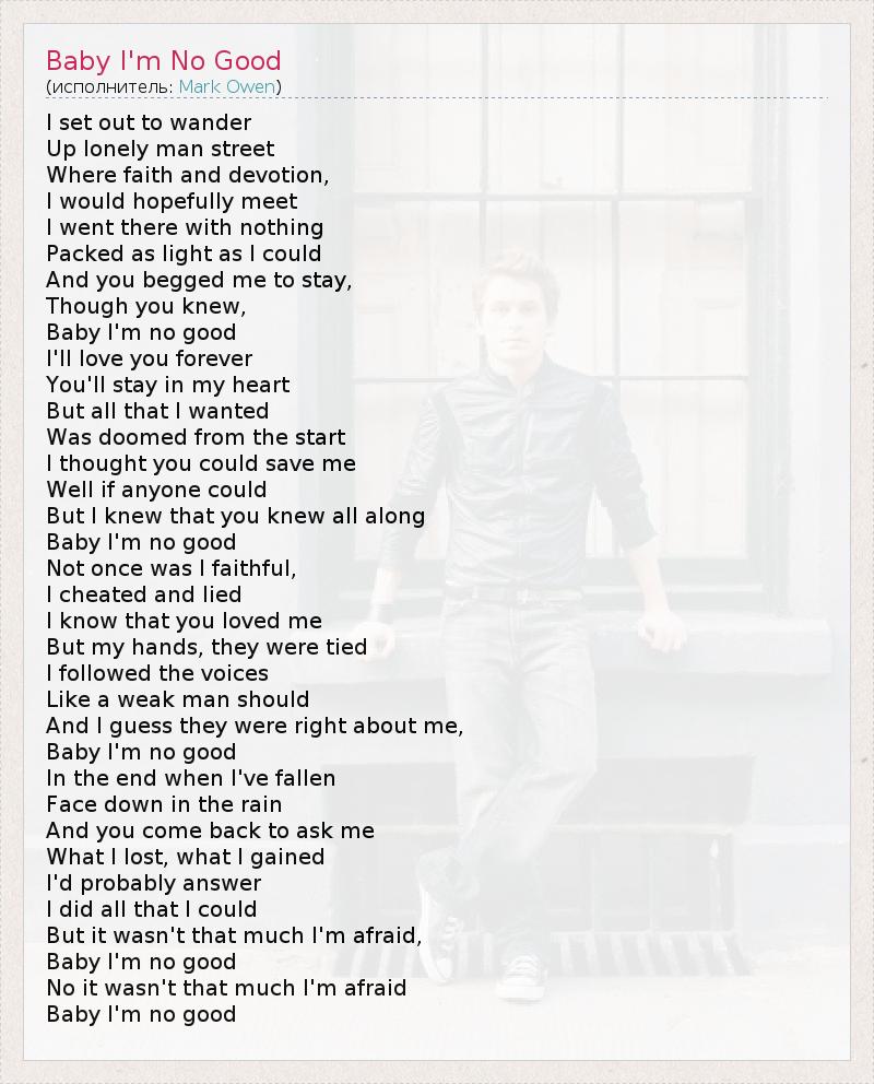 I set out to wander Up lonely man street Where faith and devotion, I would hopefully meet I went there with nothing Packed as light as I could And you begged me to stay, Though you knew, Baby I'm no good I'll love you forever You'll stay in my heart But all that I wanted Was doomed from the start I thought you could save me Well if anyone could But I knew that you knew all along Baby I'm no good Not once was I faithful, I cheated and lied I know that you loved me But my hands, they were tied I followed the voices Like a weak man should And I guess they were right about me, Baby I'm no good In the end when I've fallen Face down in the rain And you come back to ask me What I lost, what I gained I'd probably answer I did all that I could But it wasn't that much I'm afraid, Baby I'm no good No it wasn't that much I'm afraid Baby I'm no good
