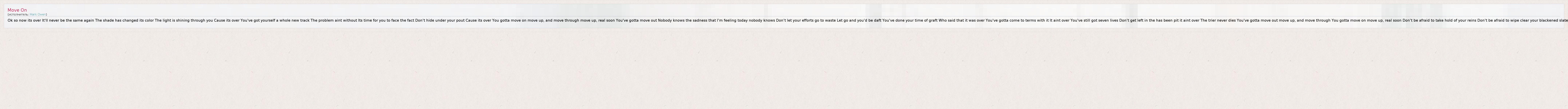 Ok so now its over It'll never be the same again The shade has changed its color The light is shining through you Cause its over You've got yourself a whole new track The problem aint without Its time for you to face the fact Don't hide under your pout Cause its over You gotta move on move up, and move through move up, real soon You've gotta move out Nobody knows the sadness that I'm feeling today nobody knows Don't let your efforts go to waste Let go and you'd be daft You've done your time of graft Who said that it was over You've gotta come to terms with it It aint over You've still got seven lives Don't get left in the has been pit it aint over The trier never dies You've gotta move out move up, and move through You gotta move on move up, real soon Don't be afraid to take hold of your reins Don't be afraid to wipe clear your blackened slate
