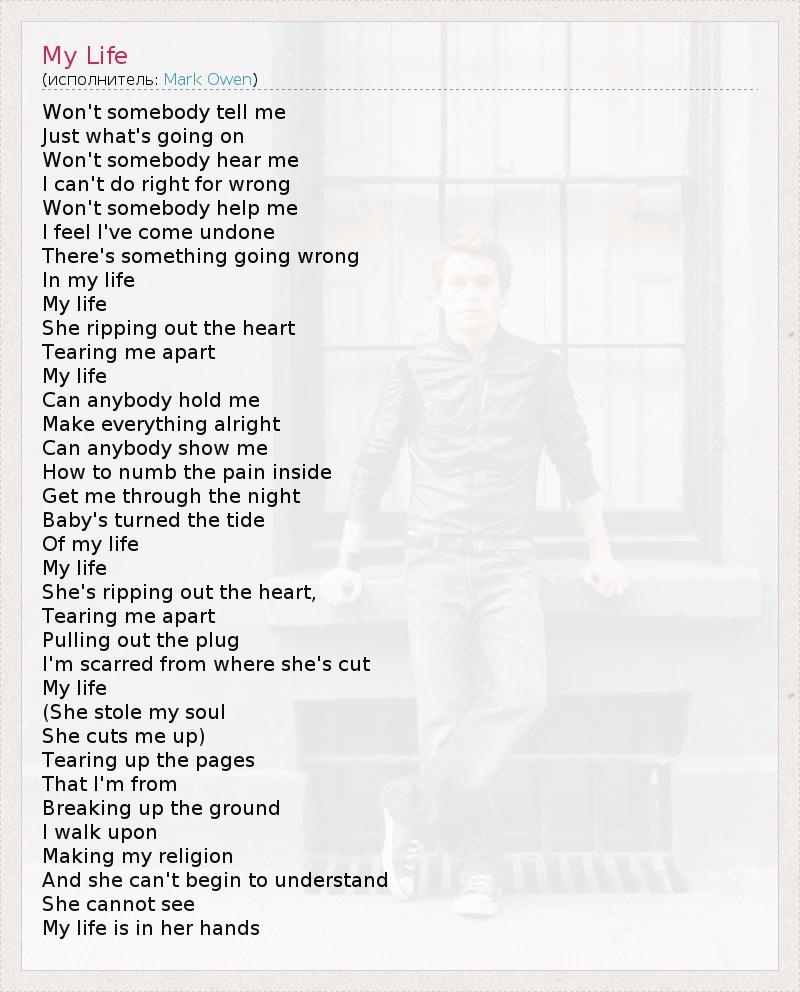 Won't somebody tell me Just what's going on Won't somebody hear me I can't do right for wrong Won't somebody help me I feel I've come undone There's something going wrong In my life My life She ripping out the heart Tearing me apart My life Can anybody hold me Make everything alright Can anybody show me How to numb the pain inside Get me through the night Baby's turned the tide Of my life My life She's ripping out the heart, Tearing me apart Pulling out the plug I'm scarred from where she's cut My life (She stole my soul She cuts me up) Tearing up the pages That I'm from Breaking up the ground I walk upon Making my religion And she can't begin to understand She cannot see My life is in her hands