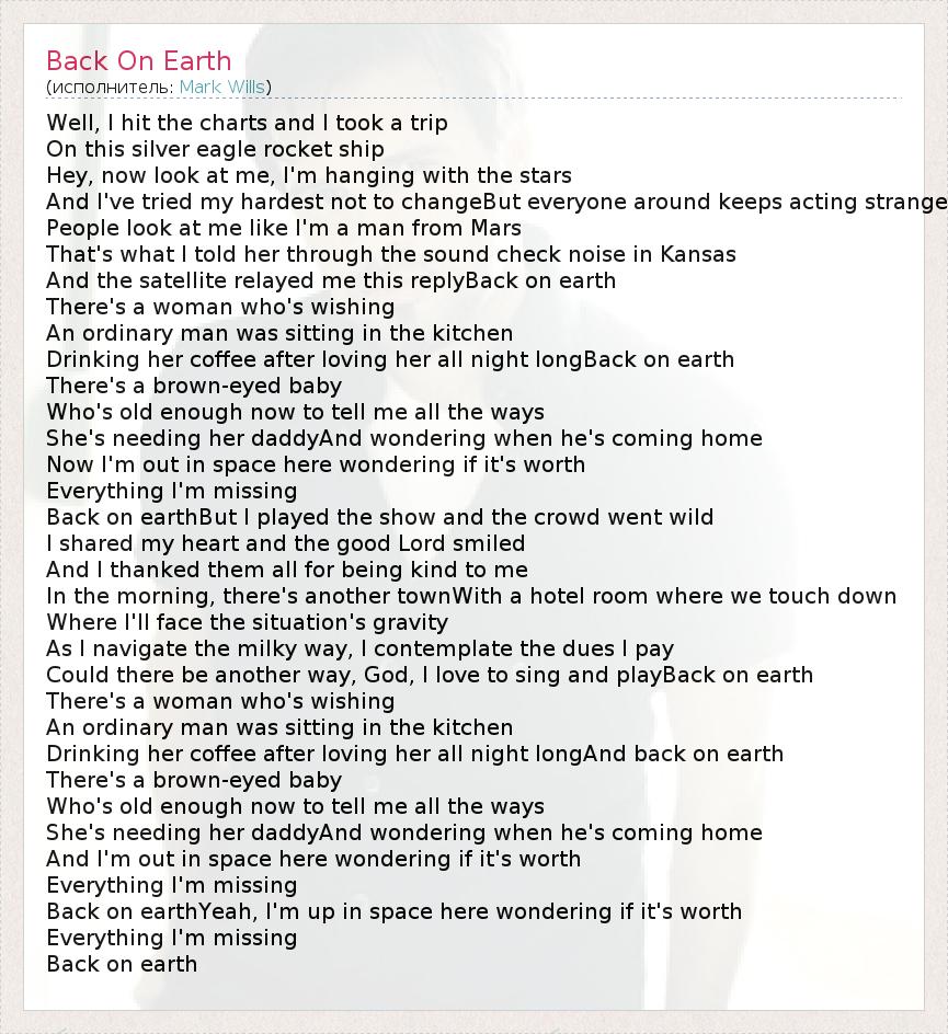 Well, I hit the charts and I took a trip On this silver eagle rocket ship Hey, now look at me, I'm hanging with the stars And I've tried my hardest not to changeBut everyone around keeps acting strange People look at me like I'm a man from Mars That's what I told her through the sound check noise in Kansas And the satellite relayed me this replyBack on earth There's a woman who's wishing An ordinary man was sitting in the kitchen Drinking her coffee after loving her all night longBack on earth There's a brown-eyed baby Who's old enough now to tell me all the ways She's needing her daddyAnd wondering when he's coming home Now I'm out in space here wondering if it's worth Everything I'm missing Back on earthBut I played the show and the crowd went wild I shared my heart and the good Lord smiled And I thanked them all for being kind to me In the morning, there's another townWith a hotel room where we touch down Where I'll face the situation's gravity As I navigate the milky way, I contemplate the dues I pay Could there be another way, God, I love to sing and playBack on earth There's a woman who's wishing An ordinary man was sitting in the kitchen Drinking her coffee after loving her all night longAnd back on earth There's a brown-eyed baby Who's old enough now to tell me all the ways She's needing her daddyAnd wondering when he's coming home And I'm out in space here wondering if it's worth Everything I'm missing Back on earthYeah, I'm up in space here wondering if it's worth Everything I'm missing Back on earth