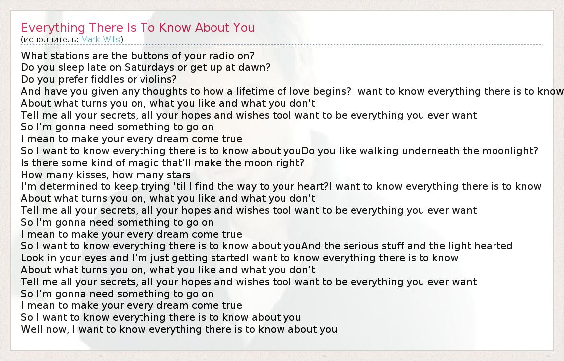 What stations are the buttons of your radio on? Do you sleep late on Saturdays or get up at dawn? Do you prefer fiddles or violins? And have you given any thoughts to how a lifetime of love begins?I want to know everything there is to know About what turns you on, what you like and what you don't Tell me all your secrets, all your hopes and wishes tooI want to be everything you ever want So I'm gonna need something to go on I mean to make your every dream come true So I want to know everything there is to know about youDo you like walking underneath the moonlight? Is there some kind of magic that'll make the moon right? How many kisses, how many stars I'm determined to keep trying 'til I find the way to your heart?I want to know everything there is to know About what turns you on, what you like and what you don't Tell me all your secrets, all your hopes and wishes tooI want to be everything you ever want So I'm gonna need something to go on I mean to make your every dream come true So I want to know everything there is to know about youAnd the serious stuff and the light hearted Look in your eyes and I'm just getting startedI want to know everything there is to know About what turns you on, what you like and what you don't Tell me all your secrets, all your hopes and wishes tooI want to be everything you ever want So I'm gonna need something to go on I mean to make your every dream come true So I want to know everything there is to know about you Well now, I want to know everything there is to know about you