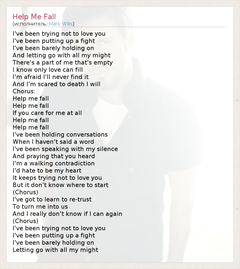I've been trying not to love you I've been putting up a fight I've been barely holding on And letting go with all my might There's a part of me that's empty I know only love can fill I'm afraid I'll never find it And I'm scared to death I will Chorus: Help me fall Help me fall If you care for me at all Help me fall Help me fall I've been holding conversations When I haven't said a word I've been speaking with my silence And praying that you heard I'm a walking contradiction I'd hate to be my heart It keeps trying not to love you But it don't know where to start (Chorus) I've got to learn to re-trust To turn me into us And I really don't know if I can again (Chorus) I've been trying not to love you I've been putting up a fight I've been barely holding on Letting go with all my might