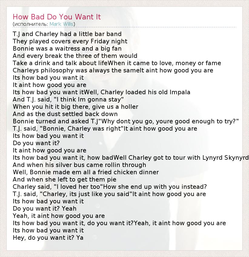 T.J and Charley had a little bar band They played covers every Friday night Bonnie was a waitress and a big fan And every break the three of them would Take a drink and talk about lifeWhen it came to love, money or fame Charleys philosophy was always the sameIt aint how good you are Its how bad you want it It aint how good you are Its how bad you want itWell, Charley loaded his old Impala And T.J. said, "I think Im gonna stay" When you hit it big there, give us a holler And as the dust settled back down Bonnie turned and asked T.J"Why dont you go, youre good enough to try?" T.J. said, "Bonnie, Charley was right"It aint how good you are Its how bad you want it Do you want it? It aint how good you are Its how bad you want it, how badWell Charley got to tour with Lynyrd Skynyrd And when his silver bus came rollin through Well, Bonnie made em all a fried chicken dinner And when she left to get them pie Charley said, "I loved her too"How she end up with you instead? T.J. said, "Charley, its just like you said"It aint how good you are Its how bad you want it Do you want it? Yeah Yeah, it aint how good you are Its how bad you want it, do you want it?Yeah, it aint how good you are Its how bad you want it Hey, do you want it? Ya