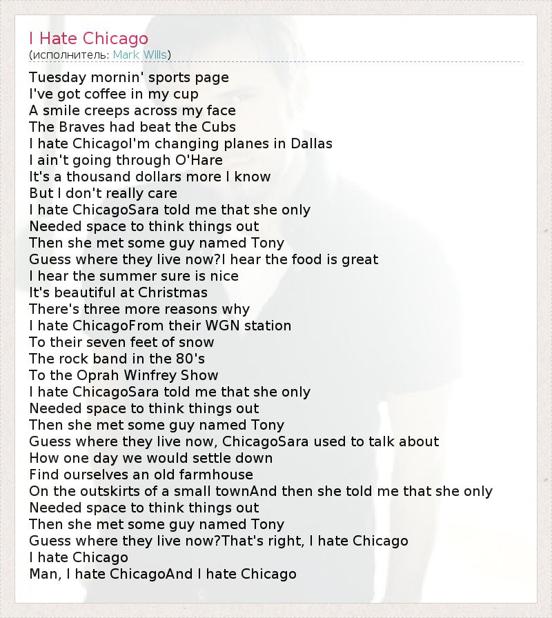 Tuesday mornin' sports page I've got coffee in my cup A smile creeps across my face The Braves had beat the Cubs I hate ChicagoI'm changing planes in Dallas I ain't going through O'Hare It's a thousand dollars more I know But I don't really care I hate ChicagoSara told me that she only Needed space to think things out Then she met some guy named Tony Guess where they live now?I hear the food is great I hear the summer sure is nice It's beautiful at Christmas There's three more reasons why I hate ChicagoFrom their WGN station To their seven feet of snow The rock band in the 80's To the Oprah Winfrey Show I hate ChicagoSara told me that she only Needed space to think things out Then she met some guy named Tony Guess where they live now, ChicagoSara used to talk about How one day we would settle down Find ourselves an old farmhouse On the outskirts of a small townAnd then she told me that she only Needed space to think things out Then she met some guy named Tony Guess where they live now?That's right, I hate Chicago I hate Chicago Man, I hate ChicagoAnd I hate Chicago