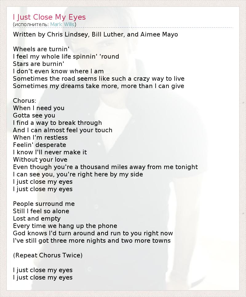 Written by Chris Lindsey, Bill Luther, and Aimee Mayo Wheels are turnin' I feel my whole life spinnin' 'round Stars are burnin' I don't even know where I am Sometimes the road seems like such a crazy way to live Sometimes my dreams take more, more than I can give Chorus: When I need you Gotta see you I find a way to break through And I can almost feel your touch When I'm restless Feelin' desperate I know I'll never make it Without your love Even though you're a thousand miles away from me tonight I can see you, you're right here by my side I just close my eyes I just close my eyes People surround me Still I feel so alone Lost and empty Every time we hang up the phone God knows I'd turn around and run to you right now I've still got three more nights and two more towns (Repeat Chorus Twice) I just close my eyes I just close my eyes
